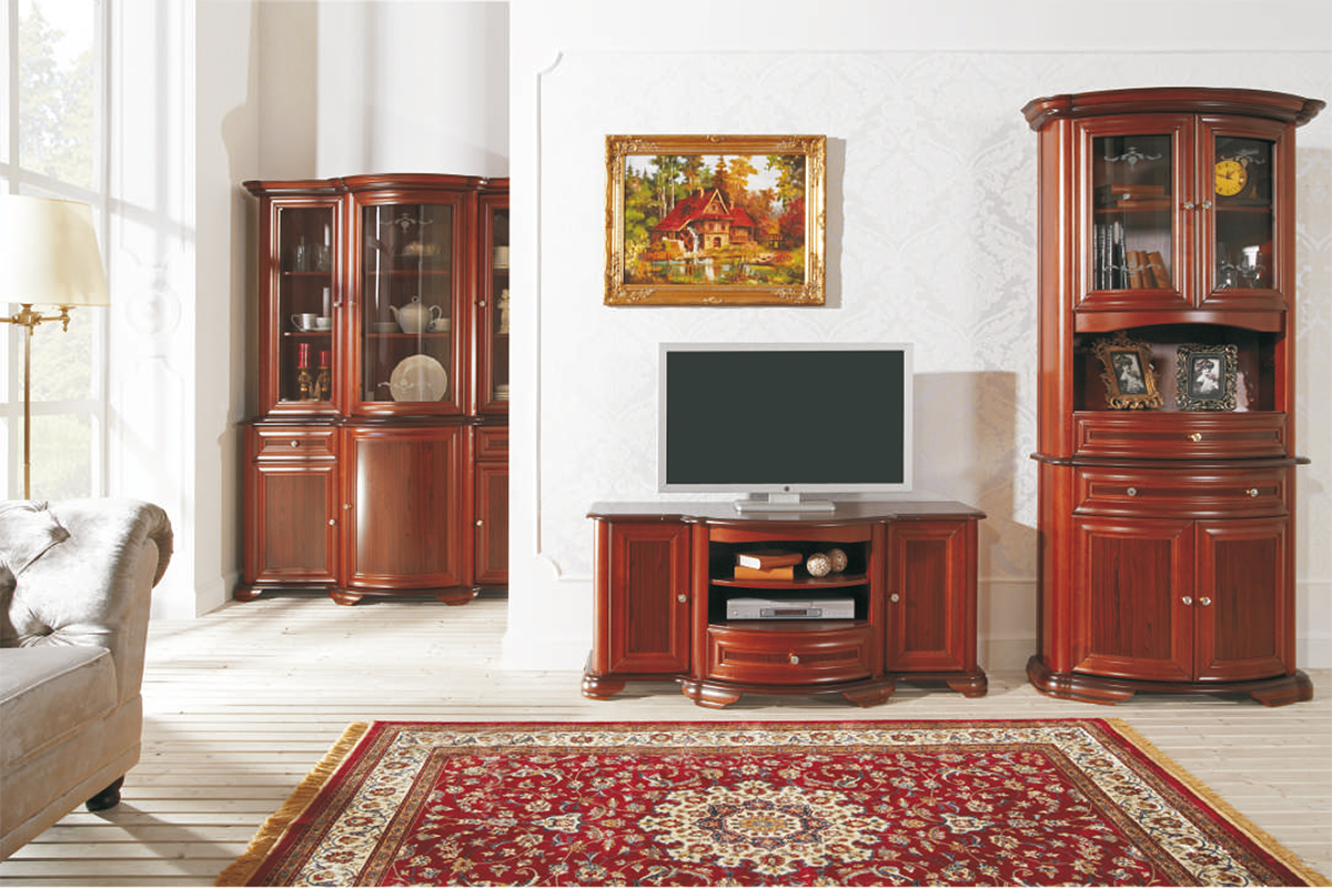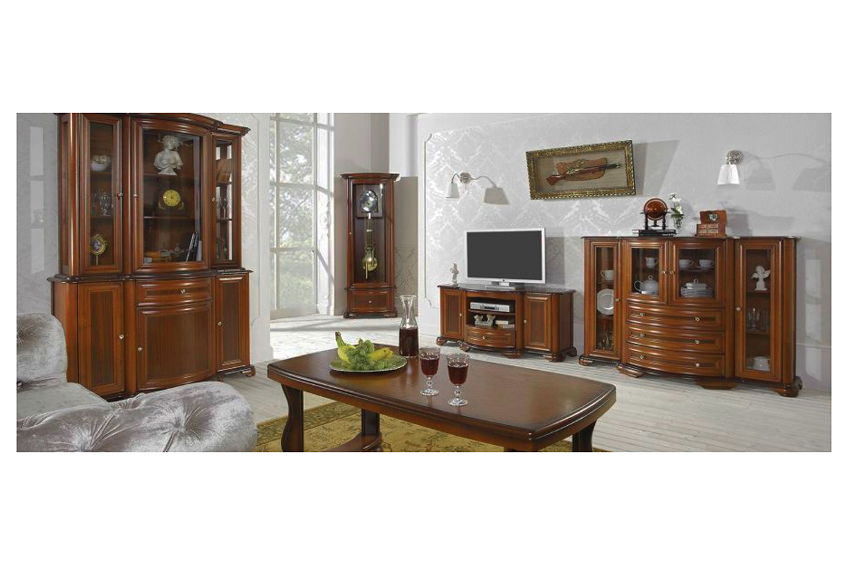 Urządzenie salonu w stylu klasycznym to znakomity pomysł. Główne miejsce spotkań z rodziną lub znajomymi powinno być bowiem reprezentatywne. Meble z kolekcji Afrodyta zostały zaprojektowane właśnie pod takim kątem. Co je dokładnie charakteryzuje? Są wytrzymałe, solidnie wykonane i doskonale prezentują się wizualnie. Dzięki temu mogą się Państwo cieszyć klasycznymi meblami przez długie lata, tym bardziej że są w pełni dopracowane. Podczas ich produkcji doświadczeni rzemieślnicy zadbali o wszystkie detale, wykańczając każdy element z niezwykłą precyzją. Za główny materiał wykonania posłużyła płyta MDF fornirowana modyfikowanym fornirem, a także szkło kryształowe. Każdy z mebli posiada gięte fronty, które dodają olbrzymiej elegancji. Bez względu na wybór (mały lub duży mebel), wszystkie prezentują się wyśmienicie – na pewno wprowadzą dużą zmianę w salonie. Zachęcamy do zakupu kompletów, aby zaaranżować całą przestrzeń. Kolekcja Afrodyta to funkcjonalne meble w korzystnej cenie!