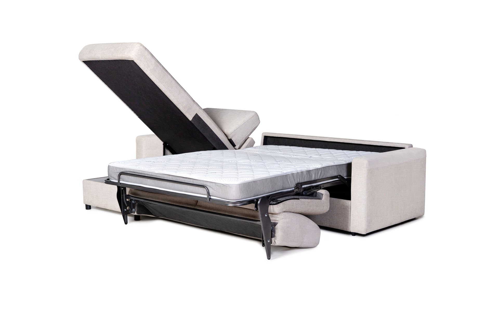 Ukryty wewnątrz konstrukcji metalowy stelaż z materacem pozwala szybko i wygodnie przekształcić narożnik w miejsce do spania – bez konieczności zdejmowania poduszek siedziskowych. To idealne rozwiązanie dla gości lub codziennego snu. - Wygodna leżanka + dwa siedziska z funkcją spania