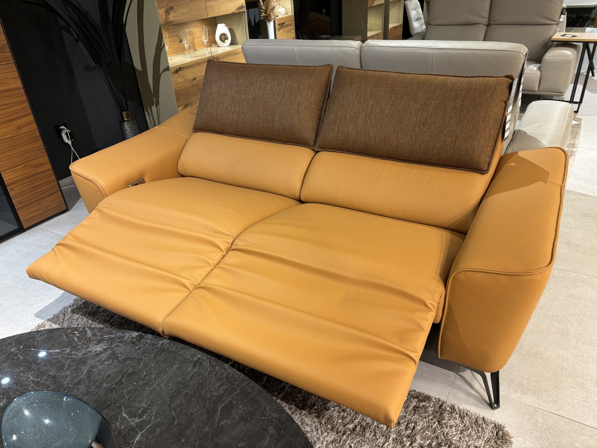 Komplet wypoczynkowy dwóch kanap o szerokości 208 cm, jedna z kanap posiada 2 relaxy elektryczne z akumulatorem.