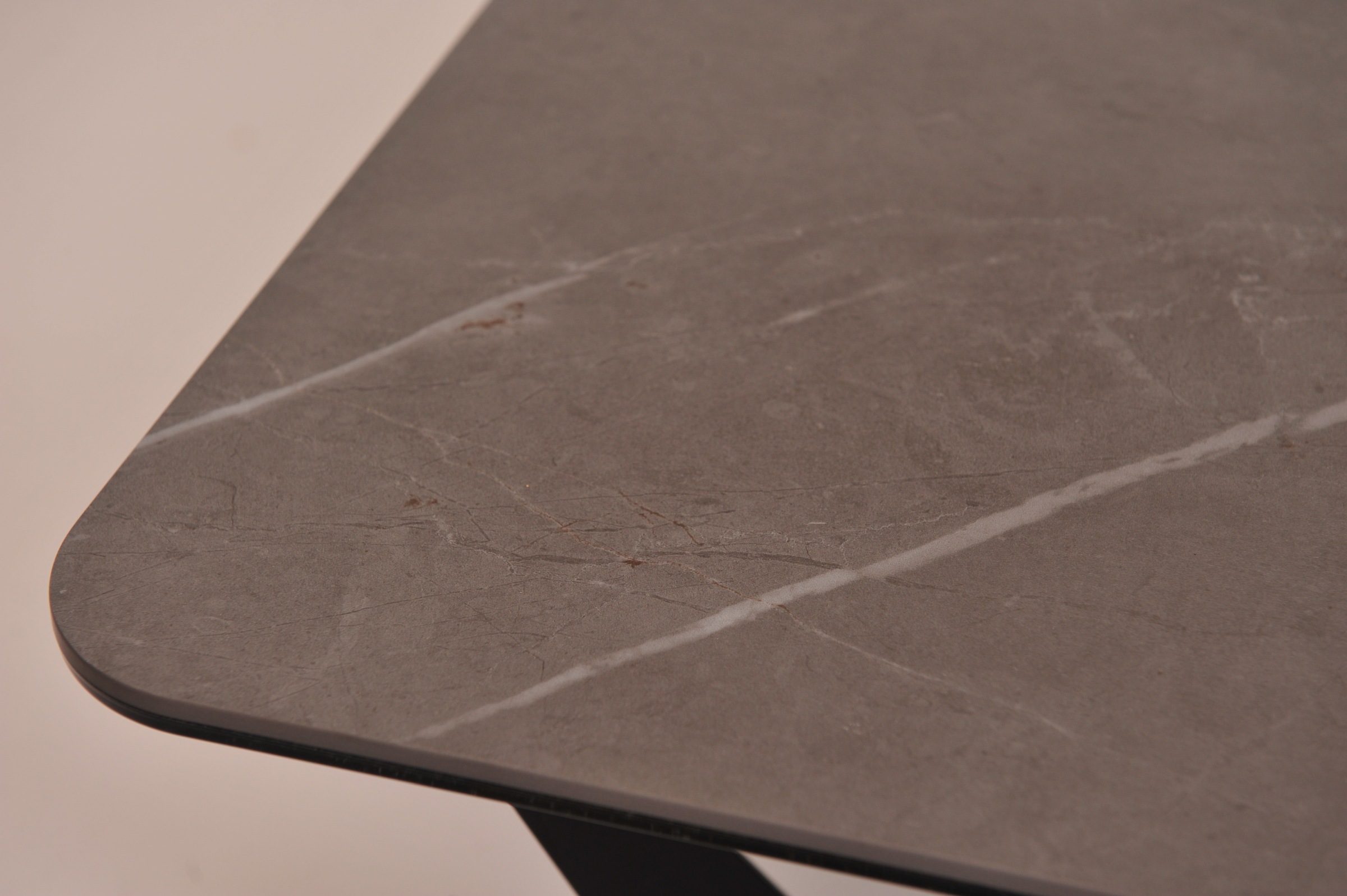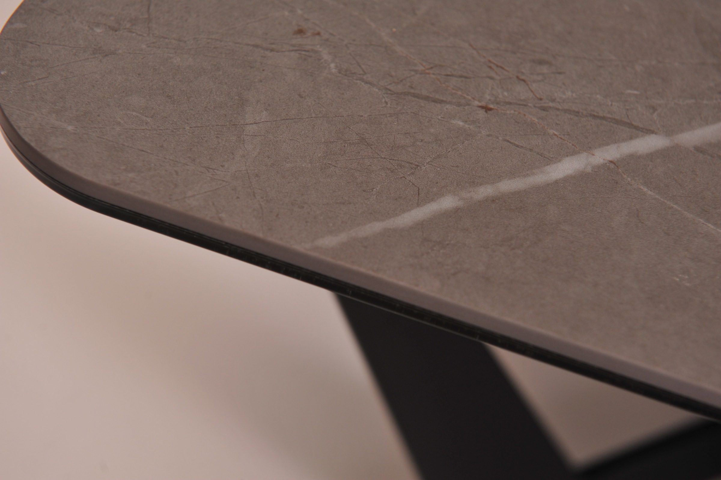 B18 stolik kawowy z matowym spiekiem kwarcowym. Model pokazany na zdjęciach posiada blat w kolorze: Pietra Grey w matowym wykończeniu. Rogi blatu są zaoblone – R50.
