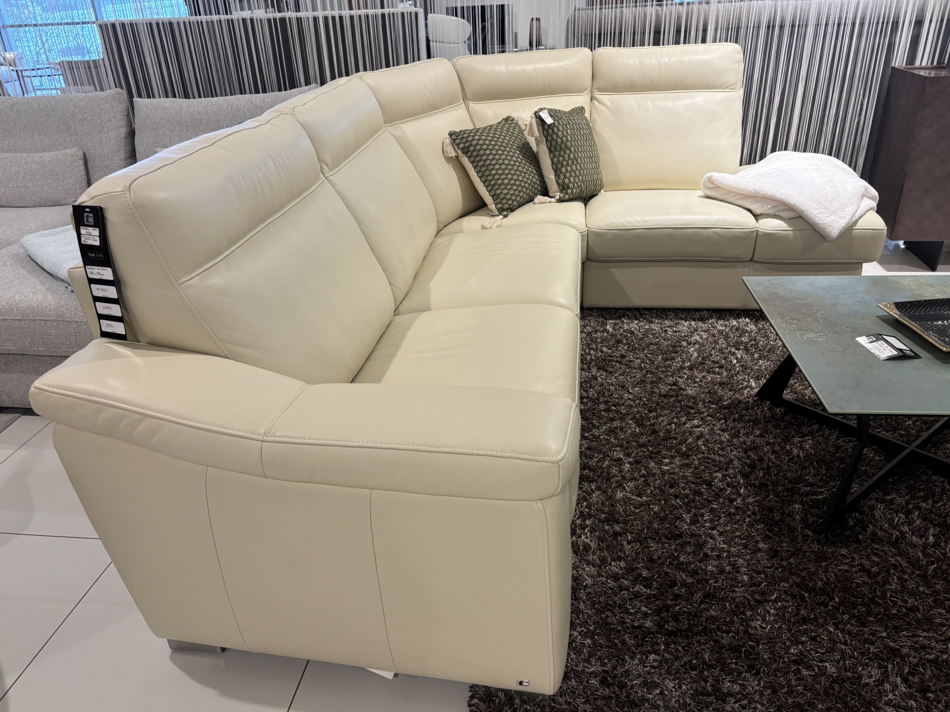 Elegancki narożnik wykonany ze skóry naturalnej w eleganckim beżowym odcieniu na wysokich nóżkach.