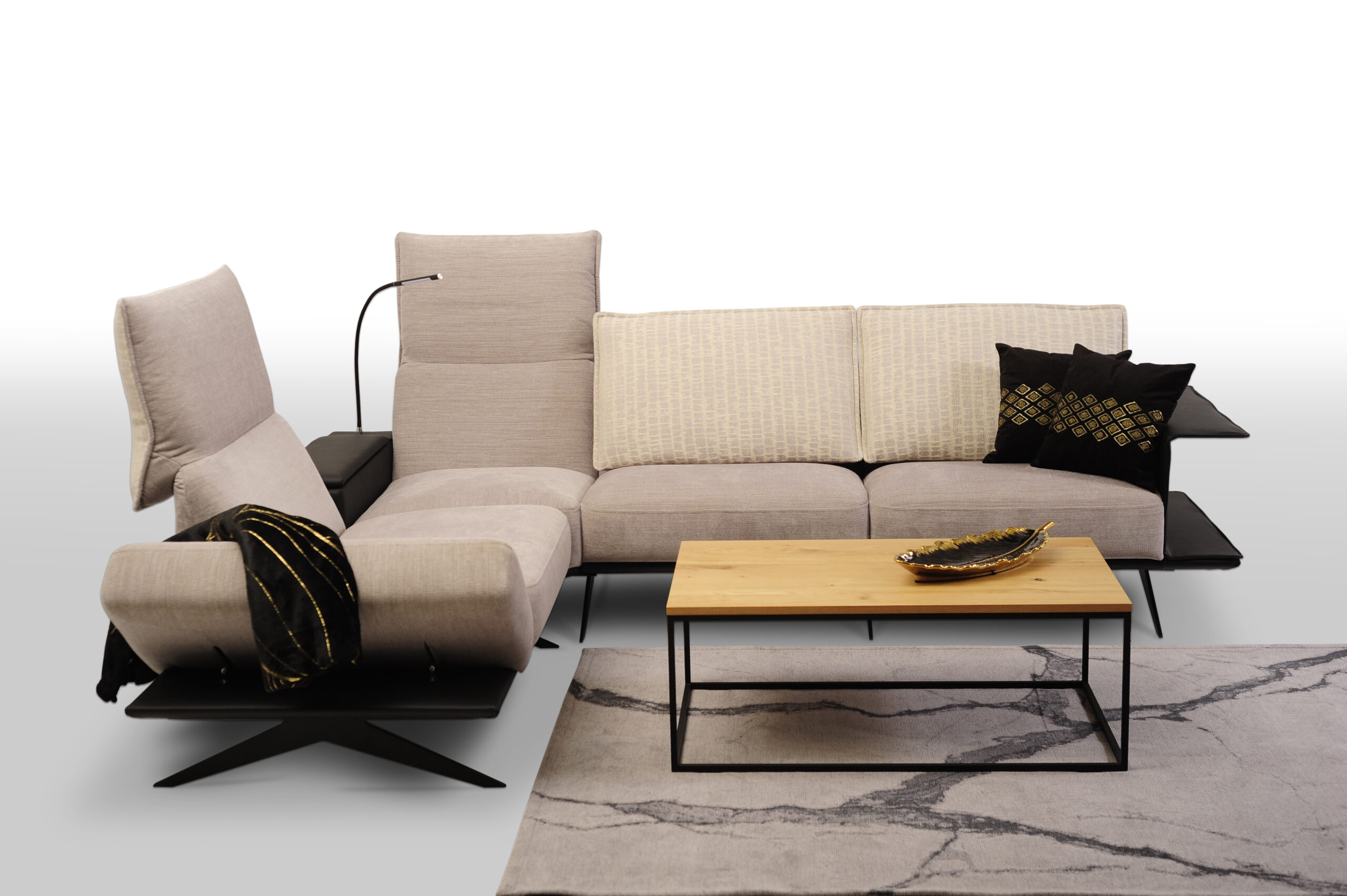 Usytułowany jest na wysokich nogach dzięki czemu jest lekki i bardzo nowoczesny. Podnoszone oparcia zmieniają całkowicie wygląd narożnika, możemy więc swobodnie zmieniać wystrój wnętrza.
