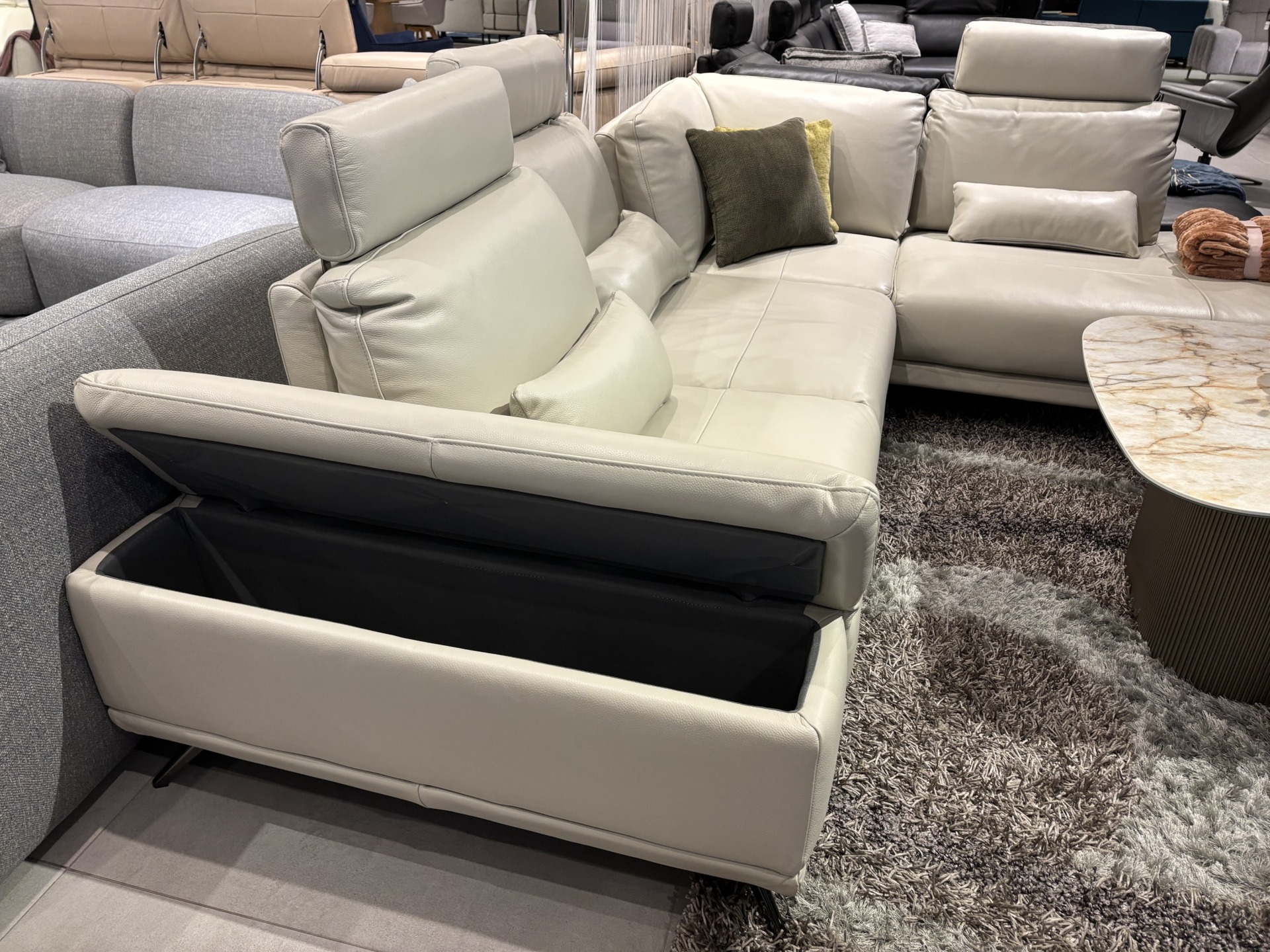 Nowoczesny narożnik wykonany ze skóry naturalnej w eleganckim beżowym odcieniu.