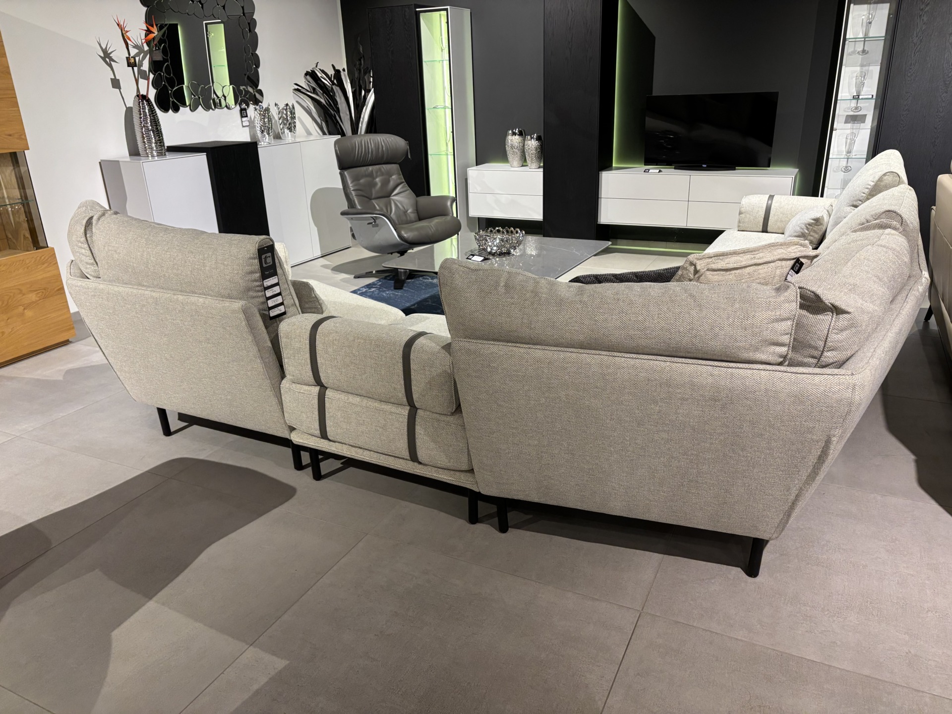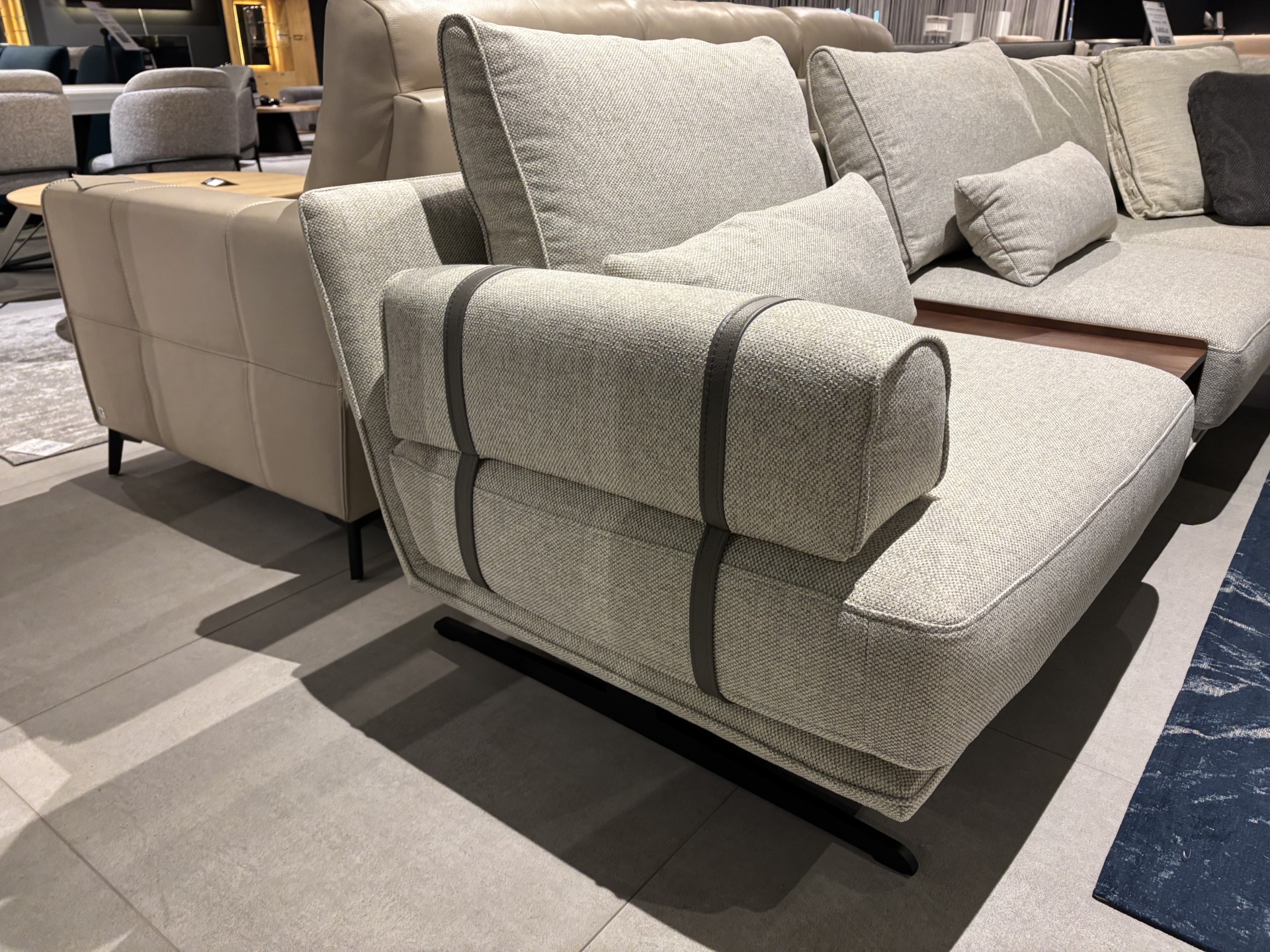 Nowoczesny narożnik modułowy wykonany z tkaniny typu melanż w odcieniu szarości z dekoracyjnymi paskami z szarej skóry.