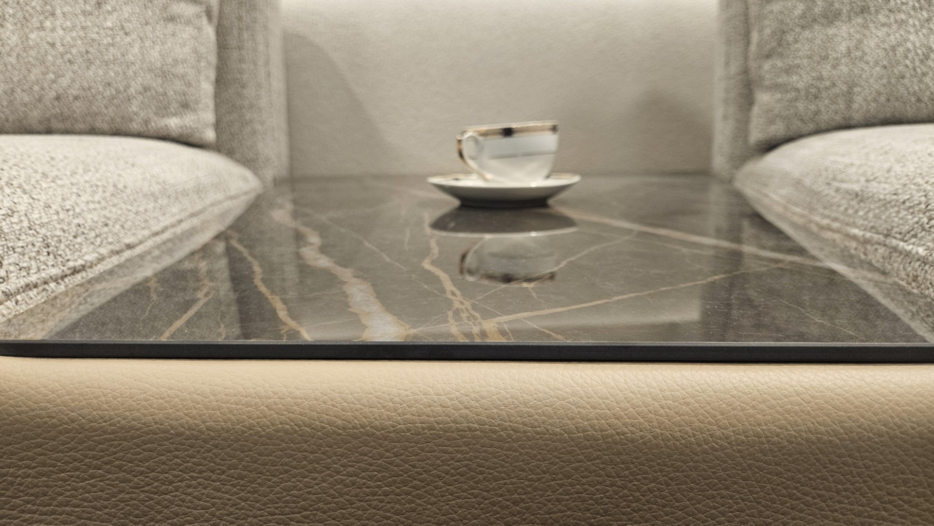 Narożnik wykonany jest z tkaniny z dodatkami z naturalnej skóry licowej.