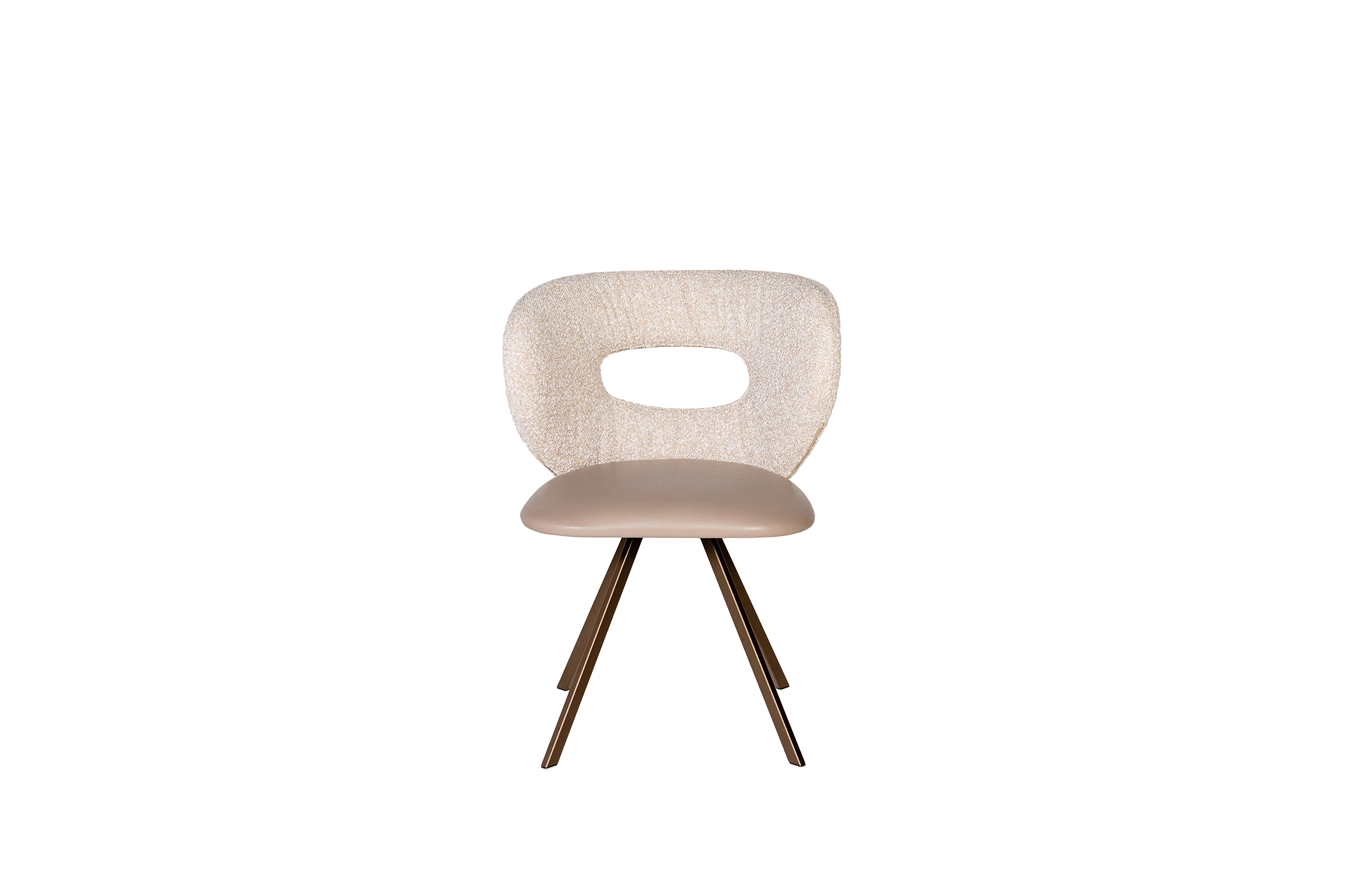 Krzesło posiada otulające oparcie, płynnie przechodzące w podłokietniki oraz wygodne siedzisko, zapewniają komfort wypoczynku. Krzesło zaprojektowane z okrągłym otworem w plecach, dodając dekoracyjne marszczenie na  oparciu. Model osadzony na solidnej metalowej brązowej nodze z funkcją obrotu. Nowoczesna forma doskonale wpasuje się w klasyczne jak i nowoczesne wnętrze, oferując wygodę i niezwykłą formę.