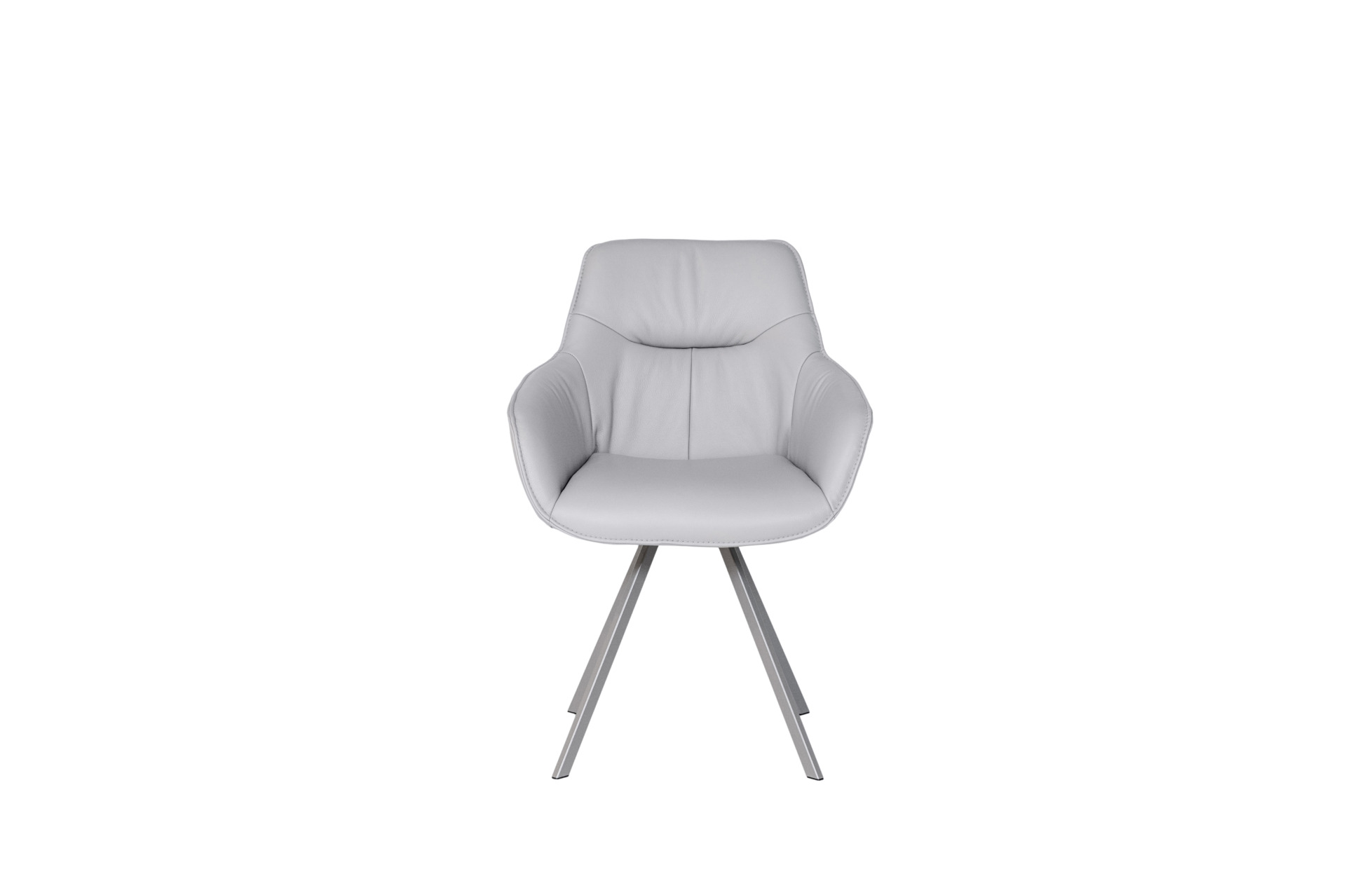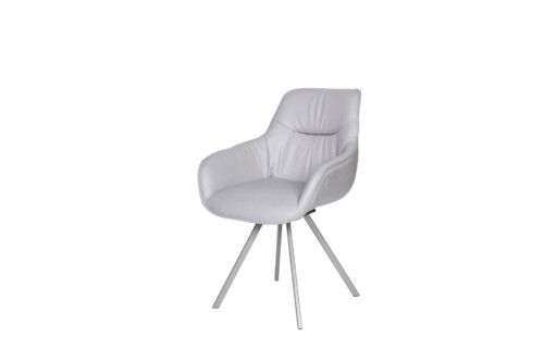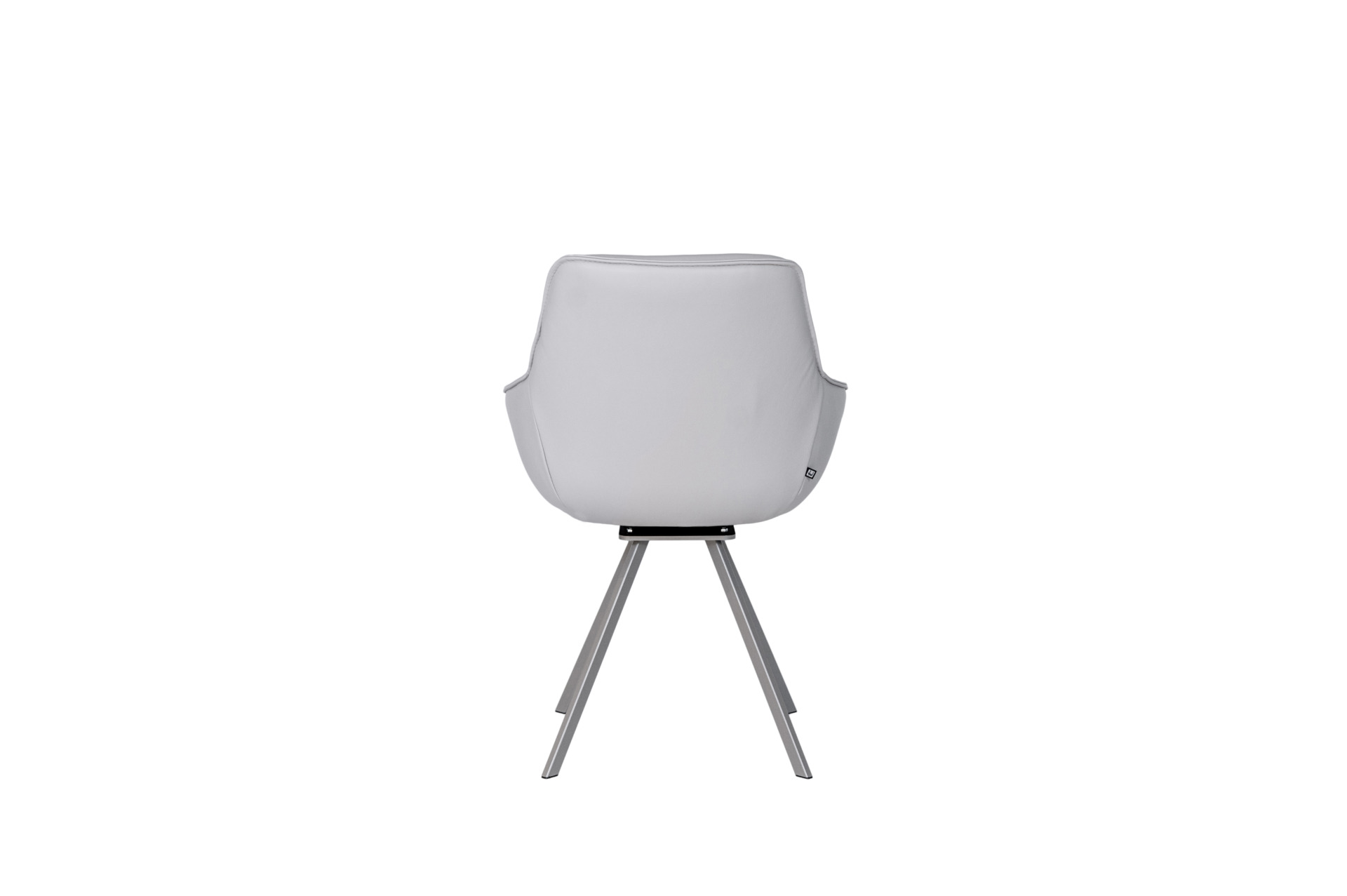 Profilowane siedzisko z delikatnie wygiętym oparciem i zintegrowanymi podłokietnikami zapewnia pełne podparcie ciała. Komfort użytkowania podnosi obrotowa noga AGAY w kolorze Horizon – eleganckim, satynowym odcieniu srebrzystej szarości. Mechanizm obrotowy gwarantuje wygodę w codziennym użytkowaniu, czyniąc krzesło idealnym zarówno do jadalni, jak i do przestrzeni biurowych czy hotelowych.