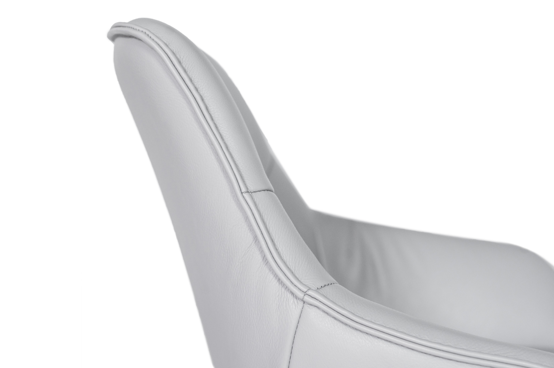 Tapicerowane w całości naturalną skórą S6-202, krzesło zachwyca swoją delikatną strukturą i miękkim dotykiem. Jasnoszary odcień skóry wprowadza do wnętrza harmonię i lekkość, a jednocześnie podkreśla luksusowy charakter mebla. Dzięki starannym przeszyciom i dopracowanym detalom K-29 prezentuje się elegancko z każdej perspektywy.