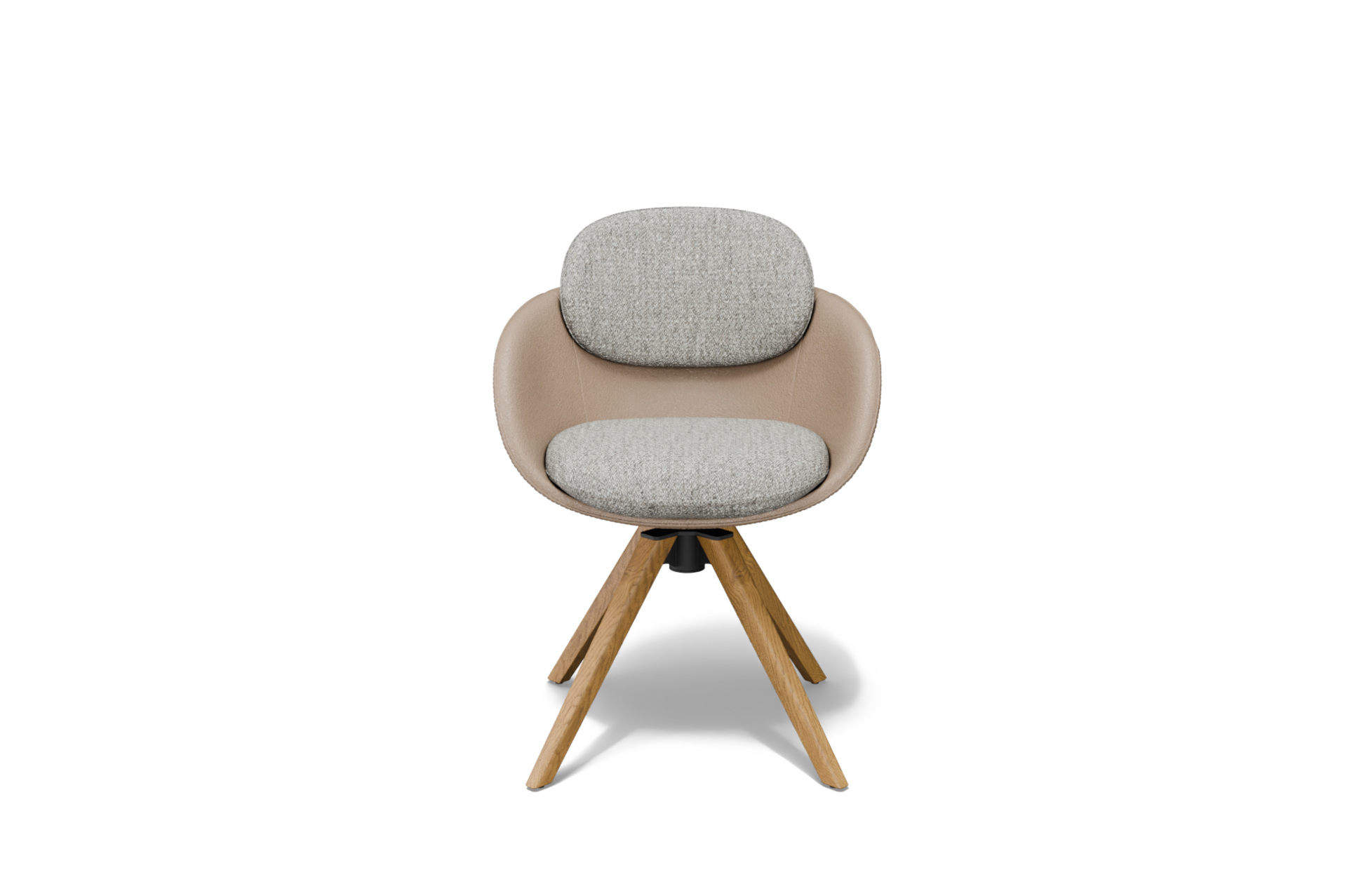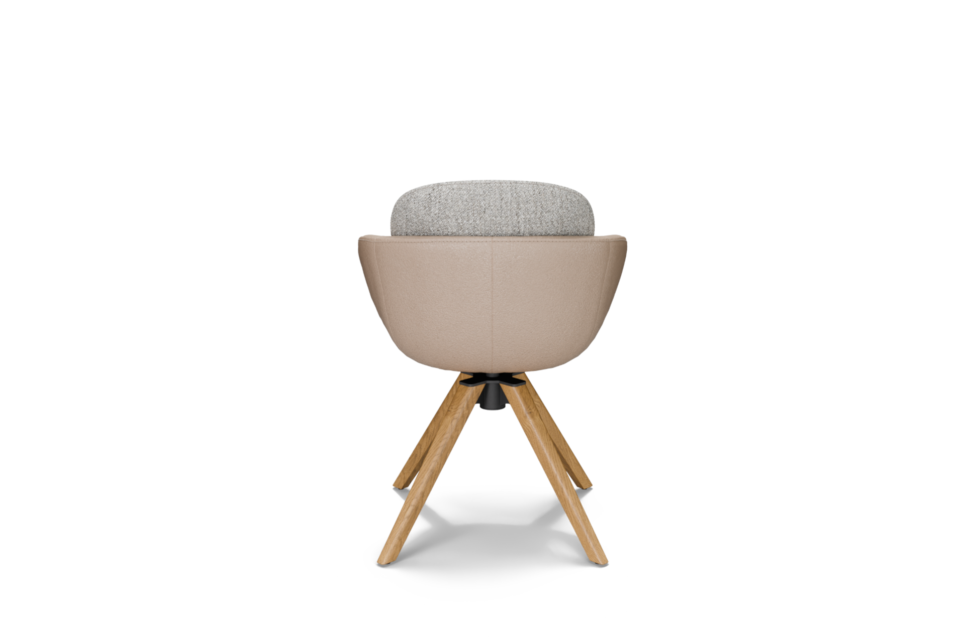 Krzesło osadzone jest na solidnej, czteroramiennej nodze wykonanej z litego dębu w kolorze naturalnym, która podkreśla szlachetny charakter mebla i nadaje mu stabilności. Zastosowany mechanizm obrotowy z funkcją powrotu do pozycji wyjściowej zwiększa wygodę użytkowania i pozwala zachować estetyczny porządek przy stole lub w przestrzeni użytkowej.