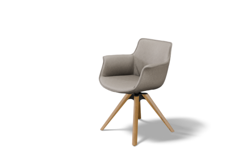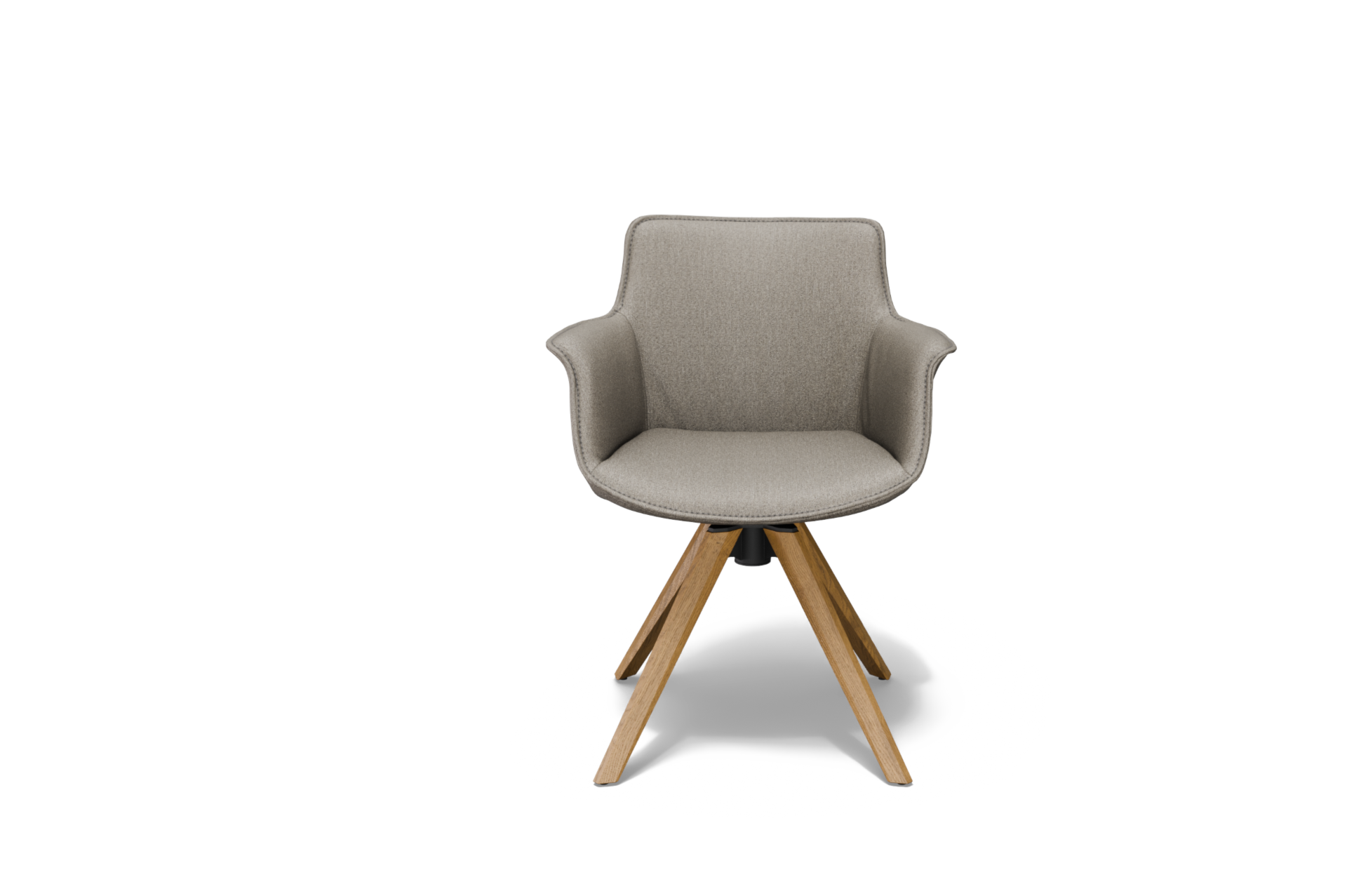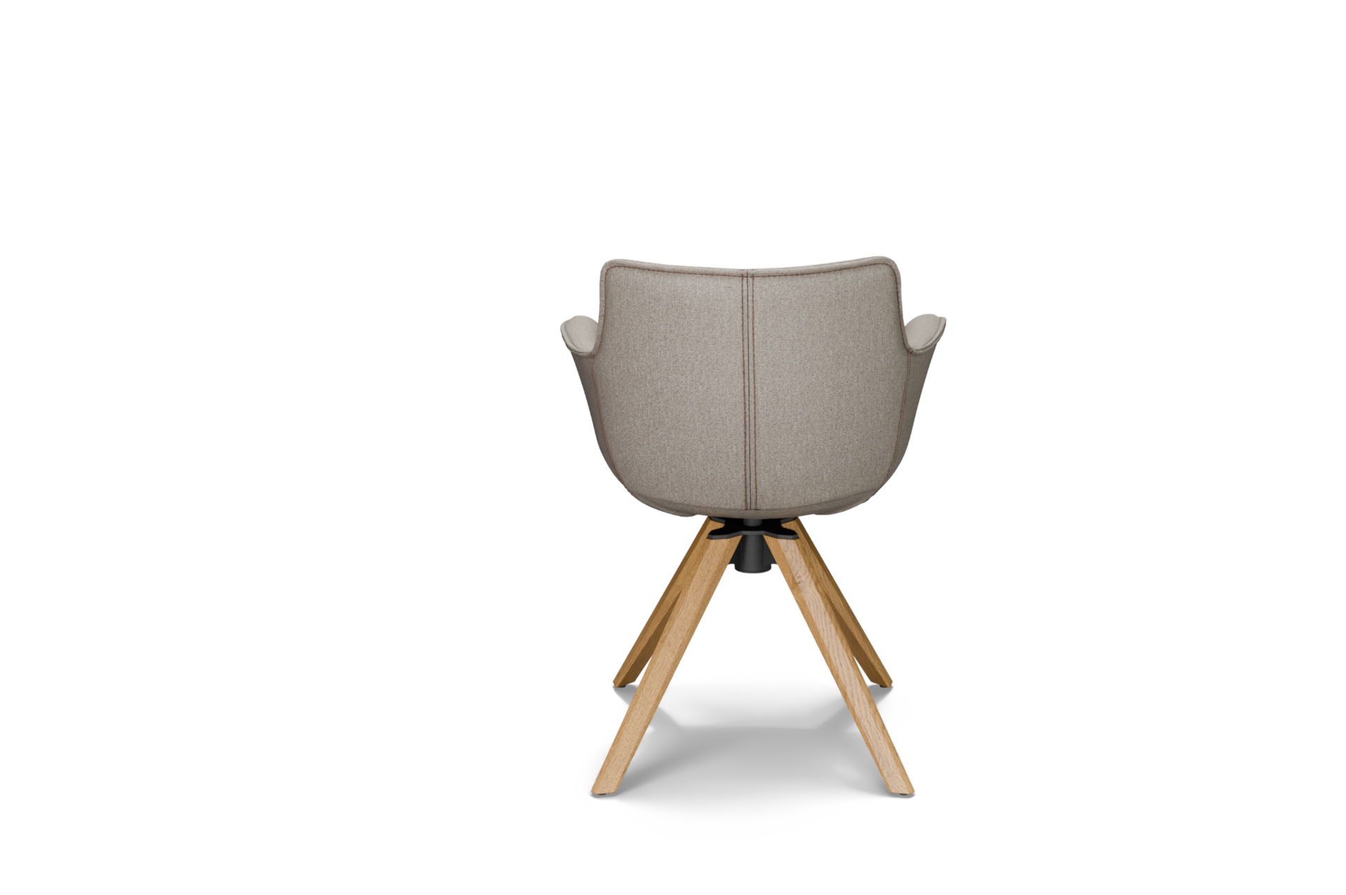 Krzesło osadzone jest na czteroramiennej, dębowej nodze z wyraźną fazą, która nadaje całości nowoczesnego, minimalistycznego wyrazu, jednocześnie podkreślając naturalne pochodzenie materiału. Zastosowany mechanizm pełnego obrotu 360° zwiększa komfort codziennego użytkowania i swobodę ruchu, przy zachowaniu estetycznego porządku wokół stołu.