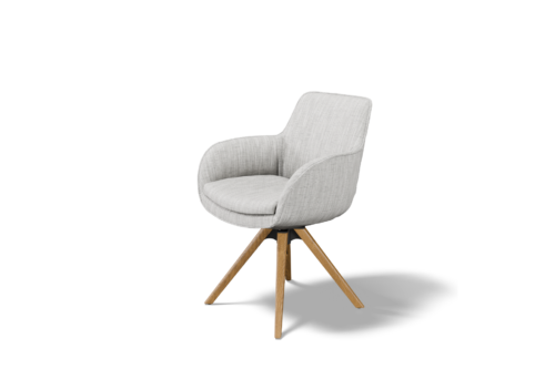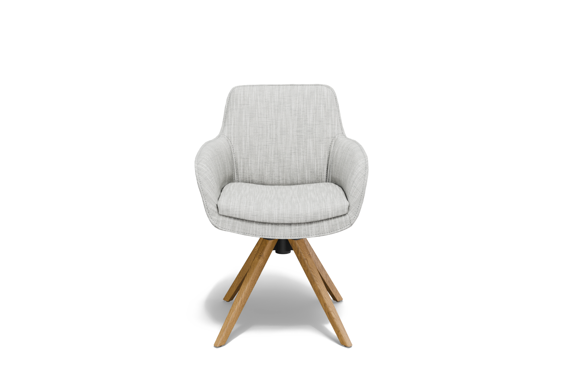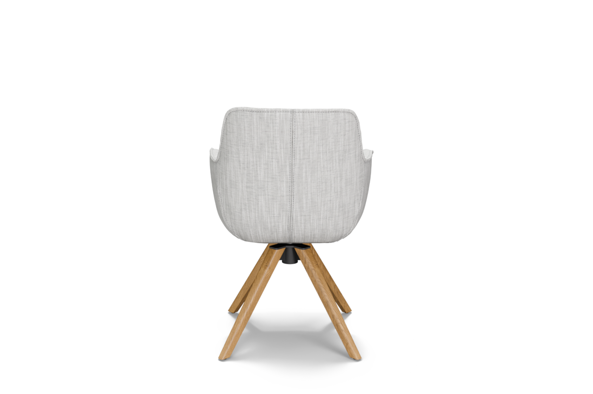 Krzesło osadzone jest na czteroramiennej nodze wykonanej z litego drewna dębowego w naturalnym wybarwieniu. Zastosowany mechanizm obrotowy z funkcją autoreturn zapewnia wysoki komfort użytkowania – siedzisko po wstaniu samoczynnie wraca do pozycji wyjściowej, co pozwala zachować estetyczny porządek przy stole.