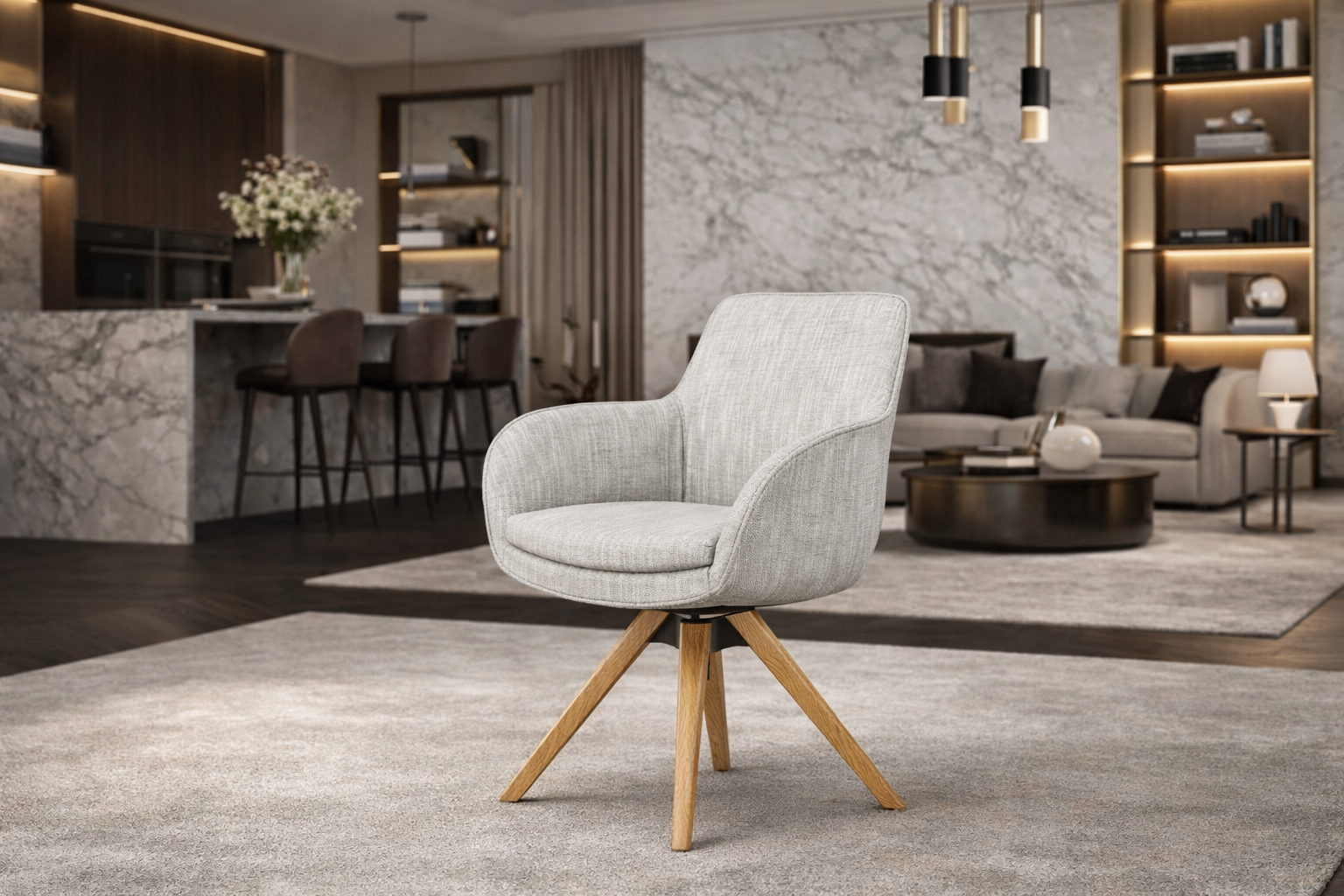 Model K-35 to bardziej masywna i komfortowa propozycja krzesła z podłokietnikami, zaprojektowana z myślą o nowoczesnych, eleganckich wnętrzach. Wyraźnie zarysowana bryła, miękkie linie oraz wygodne siedzisko sprawiają, że krzesło doskonale sprawdzi się zarówno przy stole jadalnianym, jak i w salonie czy strefie wypoczynkowej.