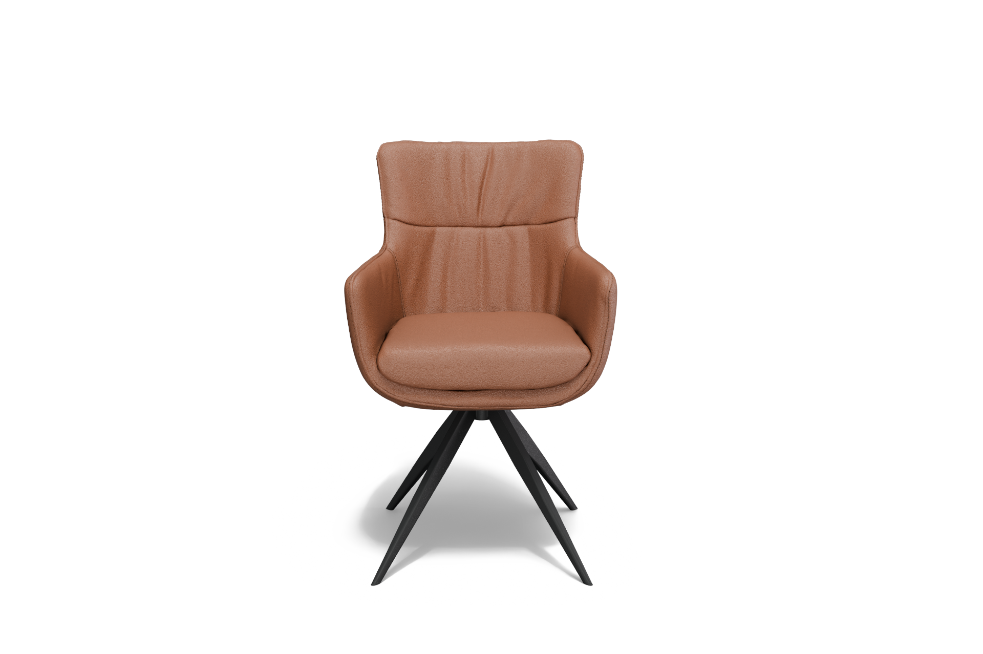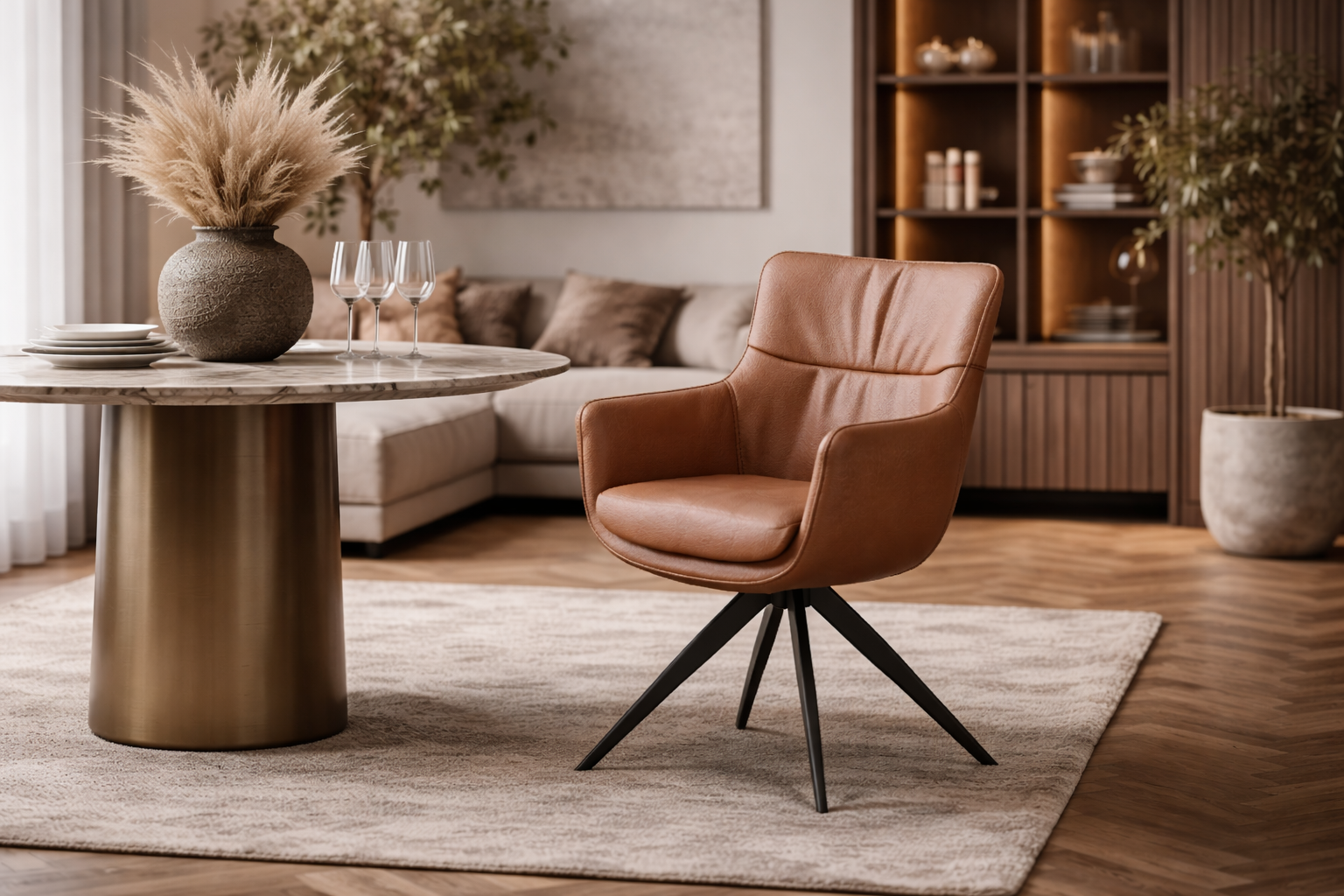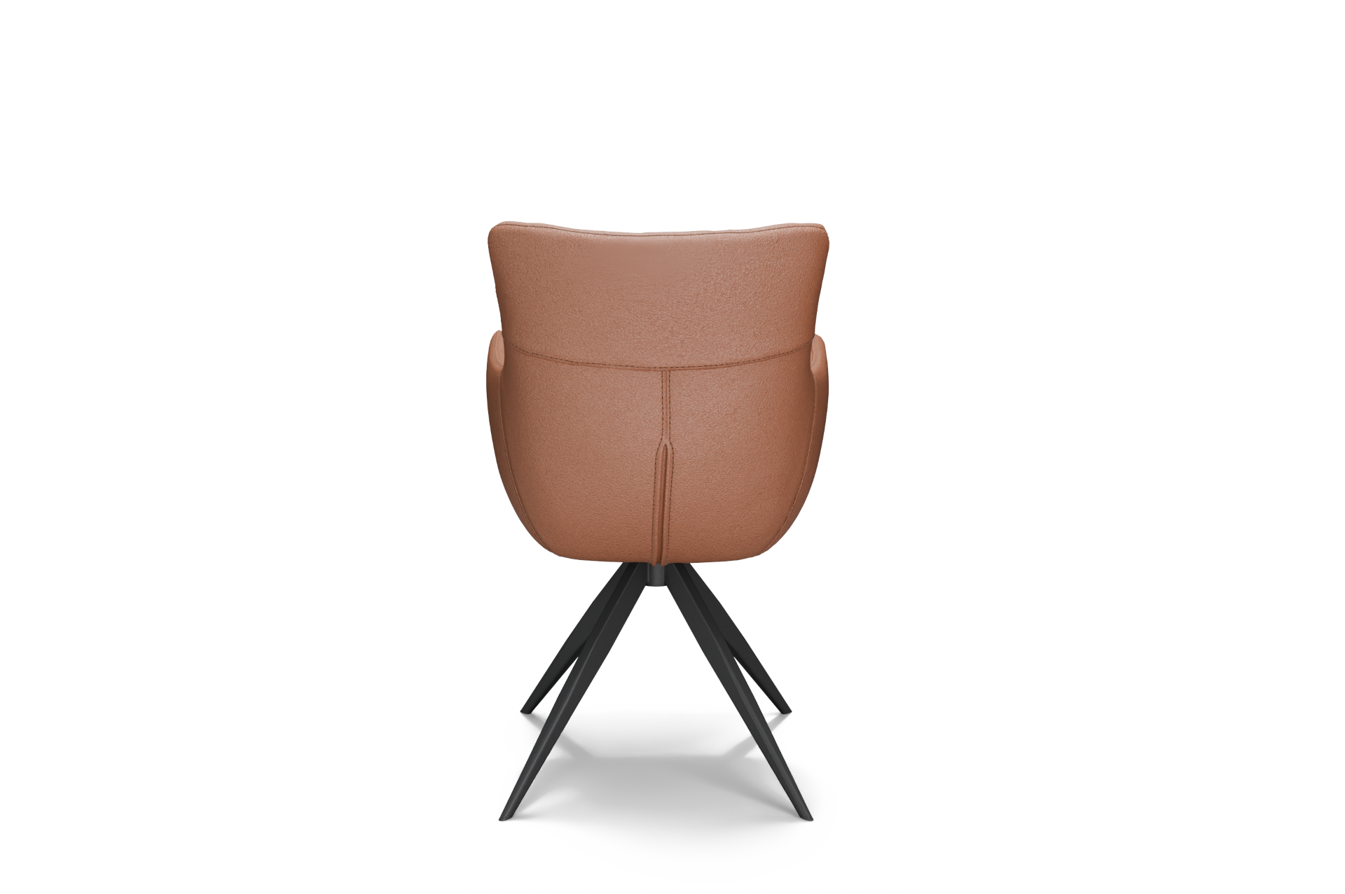 Na prezentowanych wizualizacjach krzesło pokazano na czarnej nodze metalowej, która podkreśla nowoczesny charakter konstrukcji i kontrastuje z ciepłym brązowym odcieniem skóry.