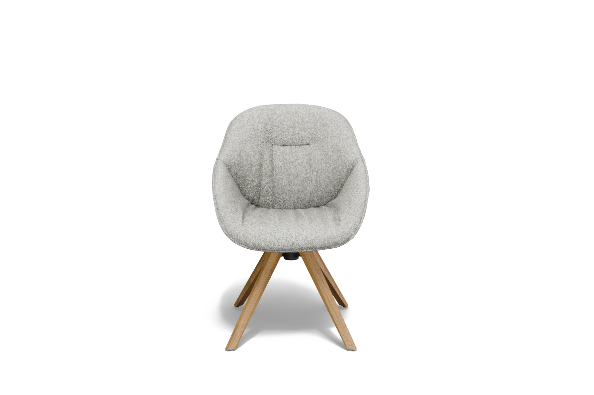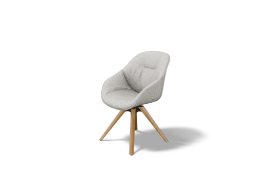 Model osadzony jest na drewnianej nodze z mechanizmem obrotu AutoReturn, który umożliwia swobodny obrót siedziska i samoczynny powrót do pozycji wyjściowej. To praktyczne rozwiązanie podnosi komfort użytkowania i pozwala zachować estetyczny porządek przy stole.