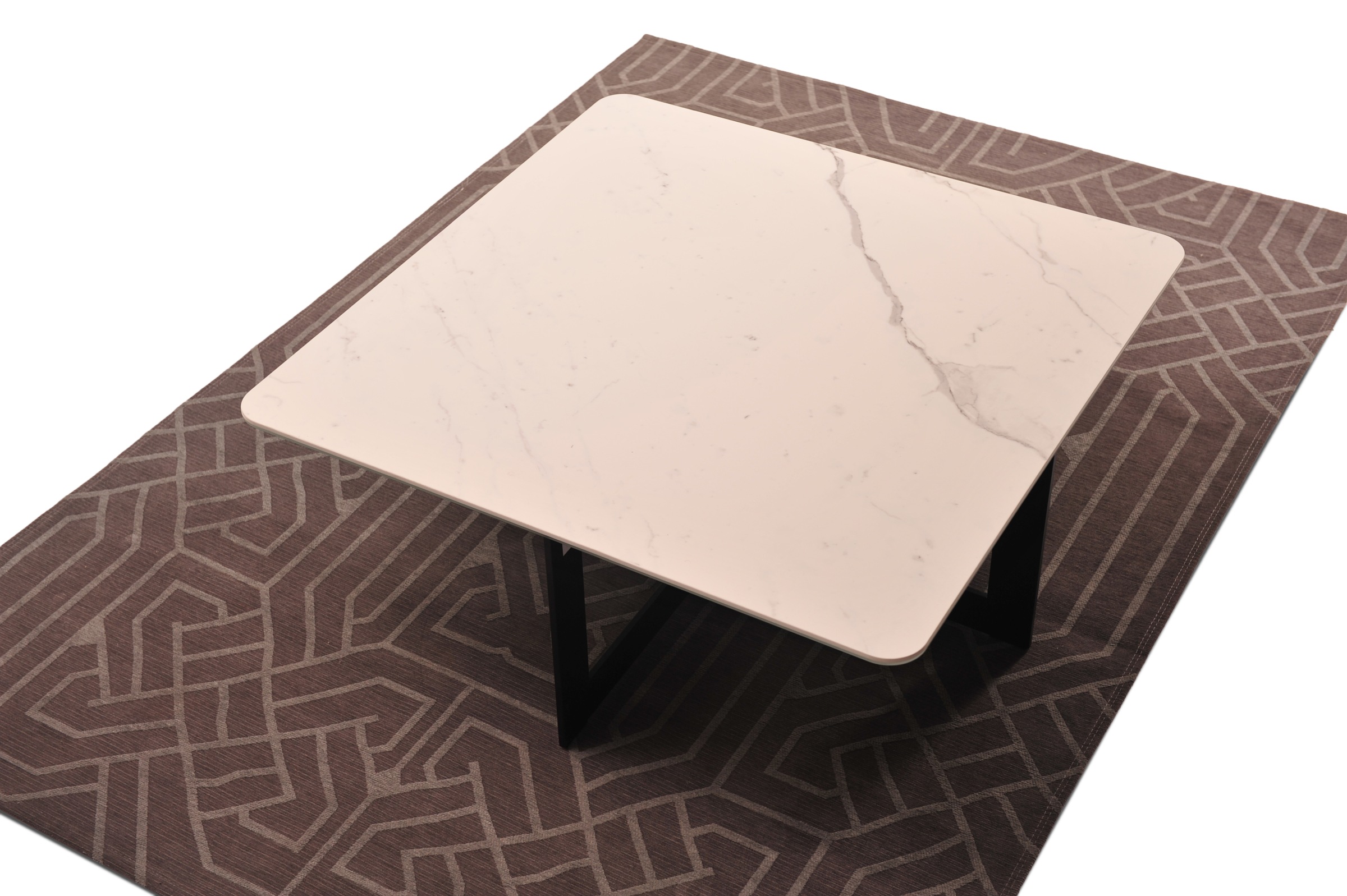 Stolik kawowy B20 – ze spieku kwarcowego na metalowych nogach. Wymiar blatu to 100×100 cm, wysokość 42 cm.