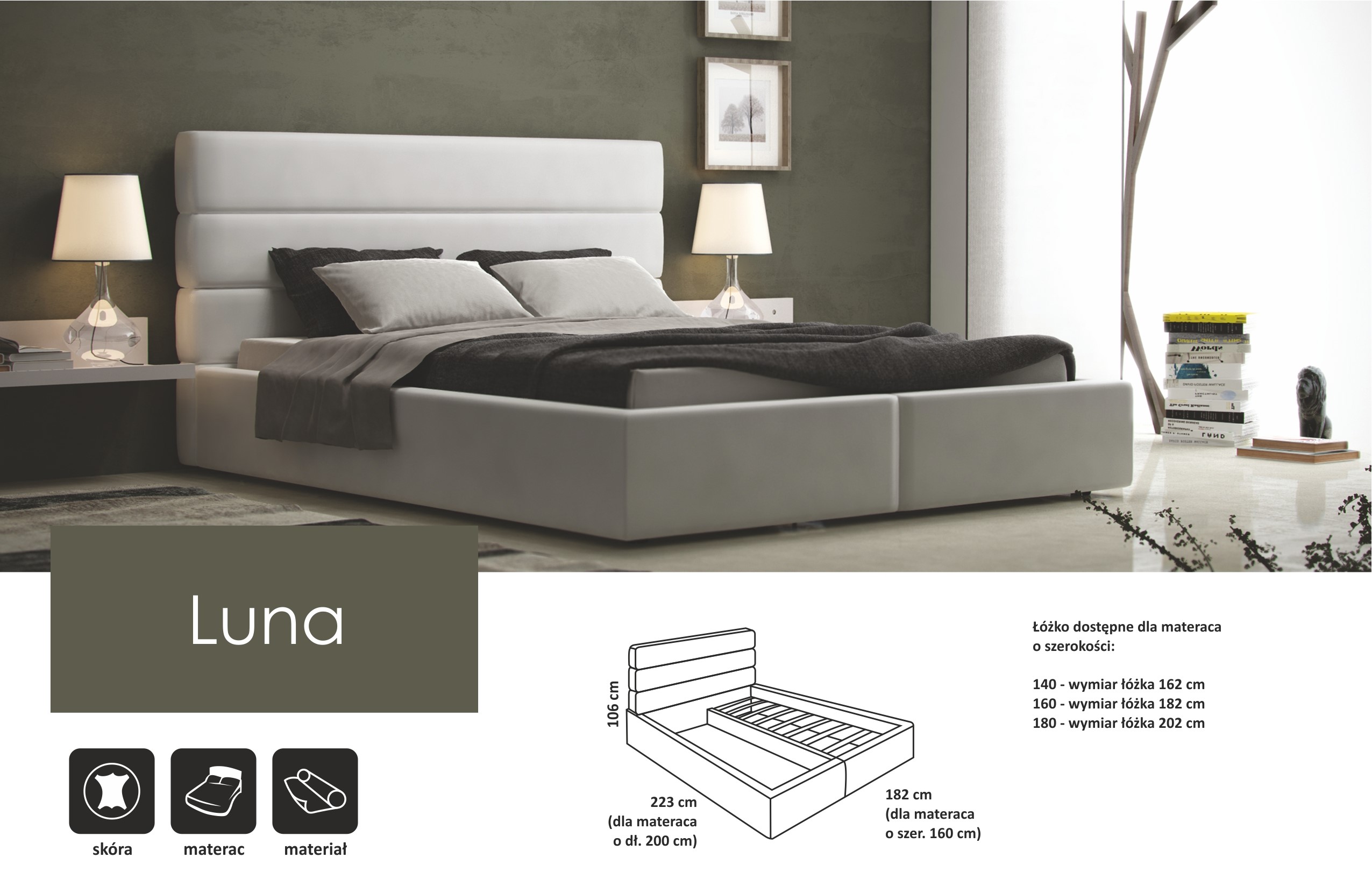 Łóżko tapicerowane dostępne jest ze skóry naturalnej lub tkaniny. Prostota i elegancja – te 2 słowa opisują model LUNA.