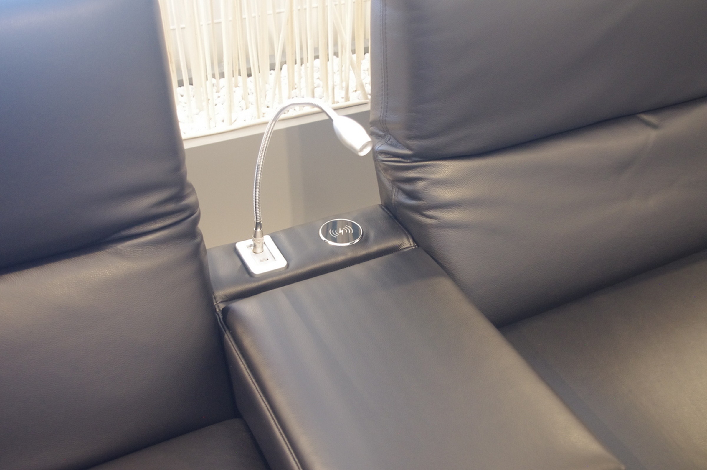 Narożnik ma w barku zamontowaną lampkę z USB oraz ładowarkę indukcyjną.
