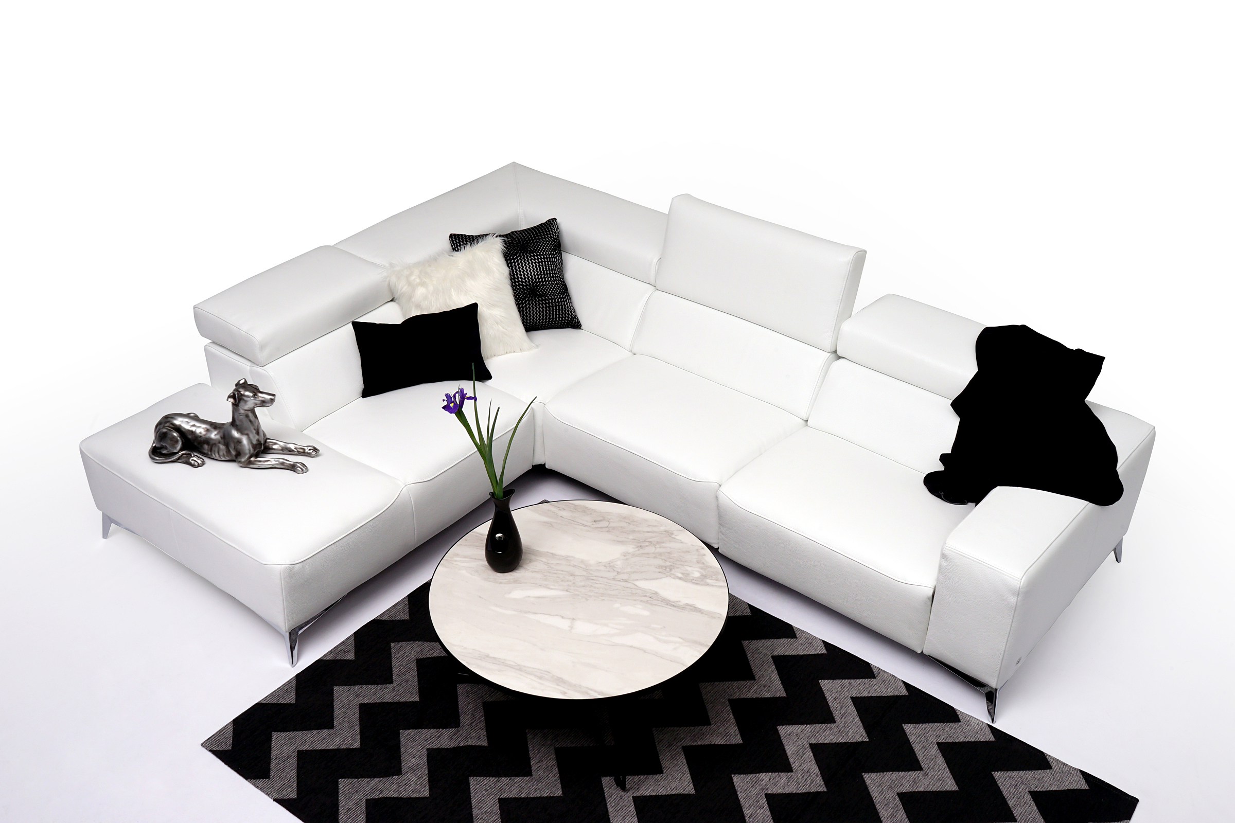 Narożna sofa Longo, obita białą skórą naturalną, wyposażona w funkcję relaksu i o wymiarach 229 x 297 cm, elegancko komponuje się z czarno-białym dywanem w zygzak i okrągłym marmurowym stolikiem kawowym. Całość uzupełniają elementy dekoracyjne, takie jak czarny wazon z kwiatami, srebrna rzeźba psa, poduszki i pluszowy pled.