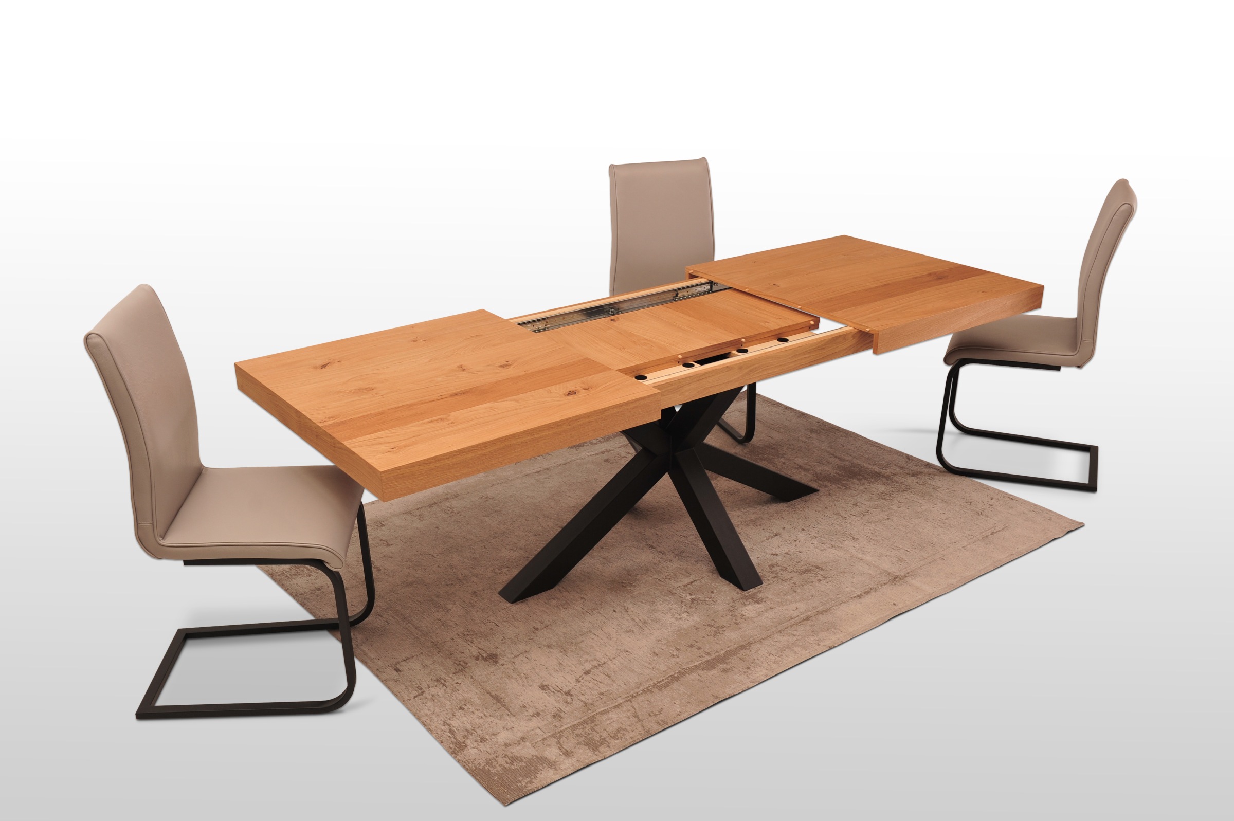 Wkładki wykonane są z tego samego forniru, mieszczą się pod blatem i montuje się je po rozsunięciu blatu stołu.
