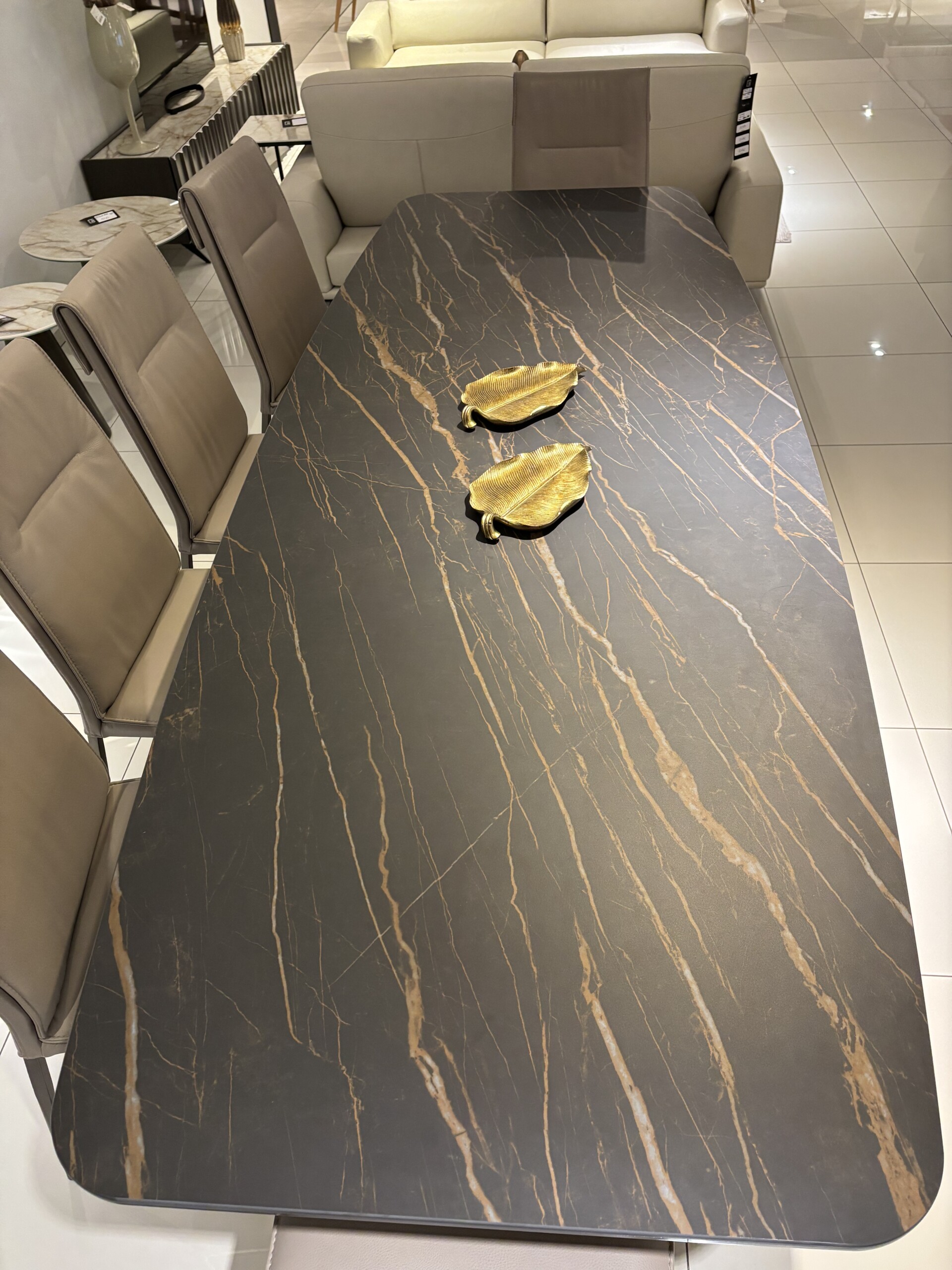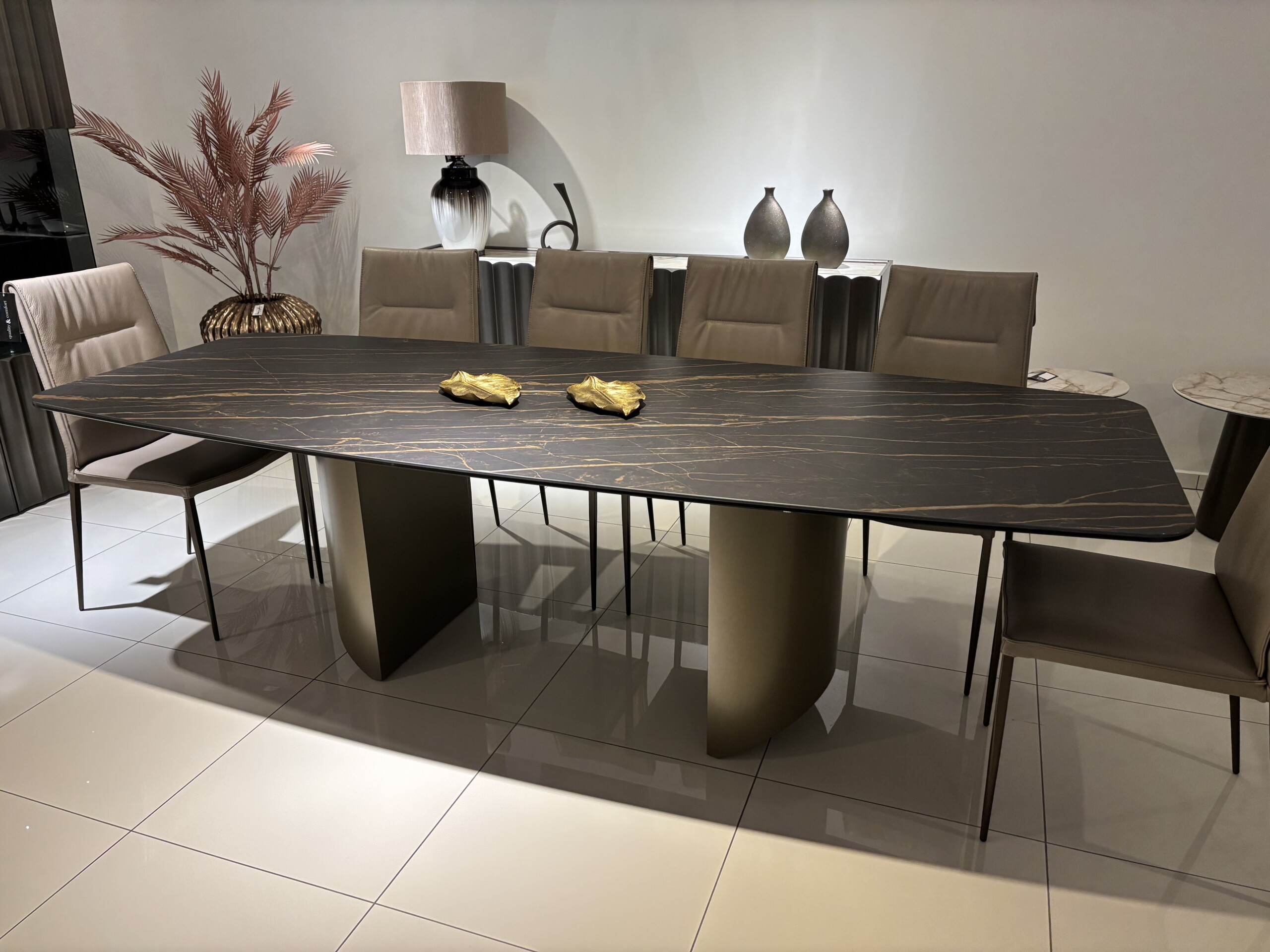 Stół z blatem ze spieku kwarcowego: Noir Desir mat w kształcie beczki,