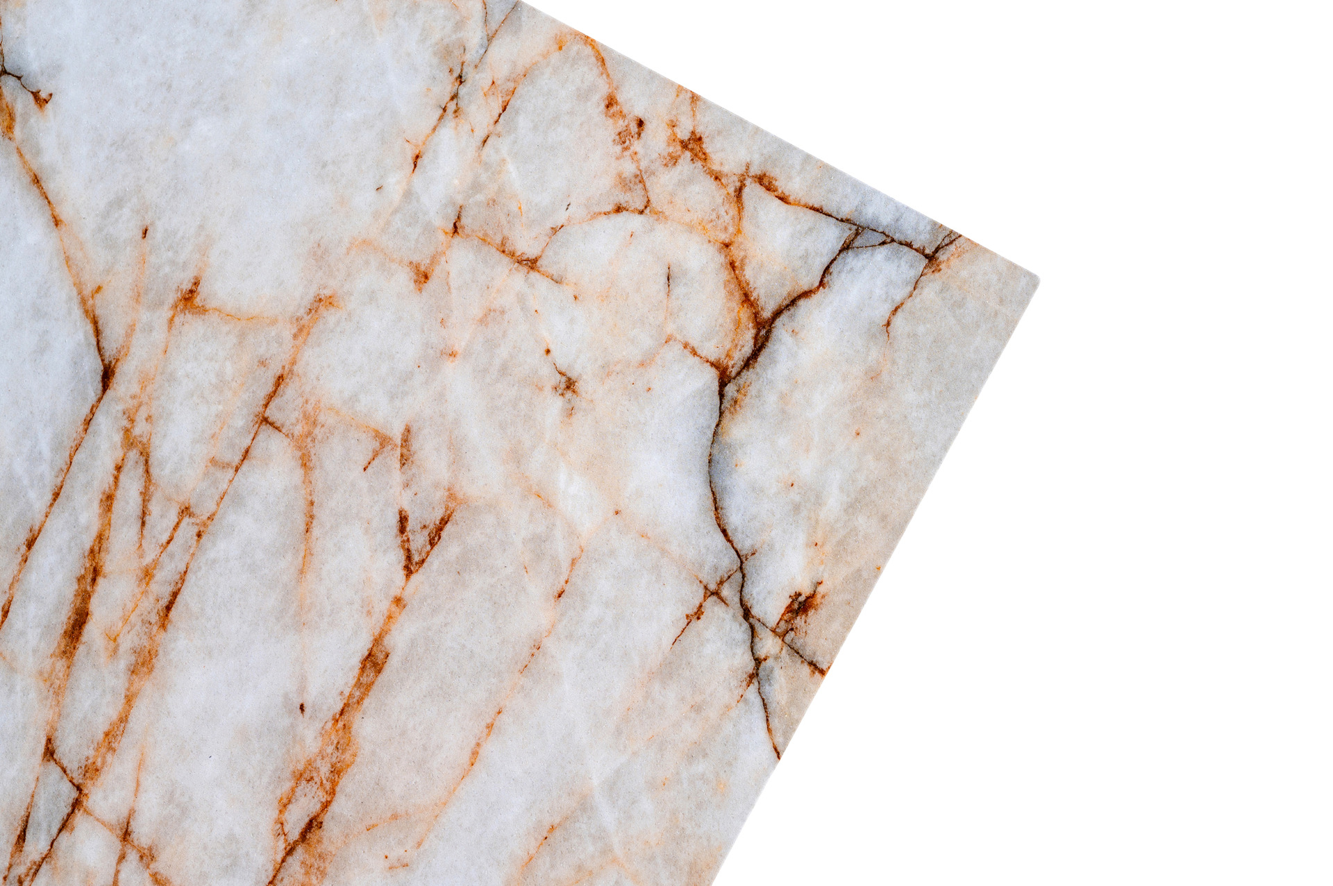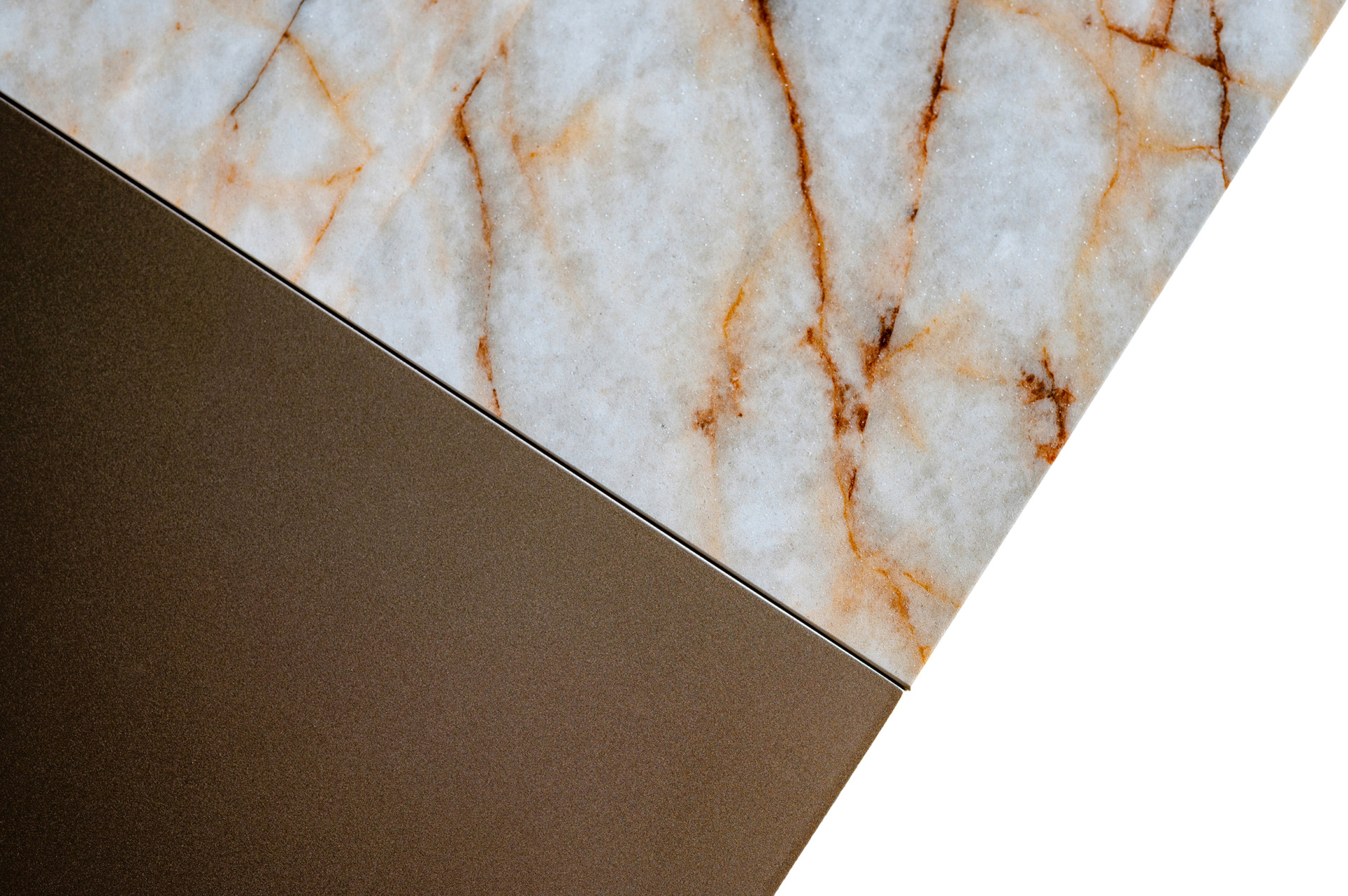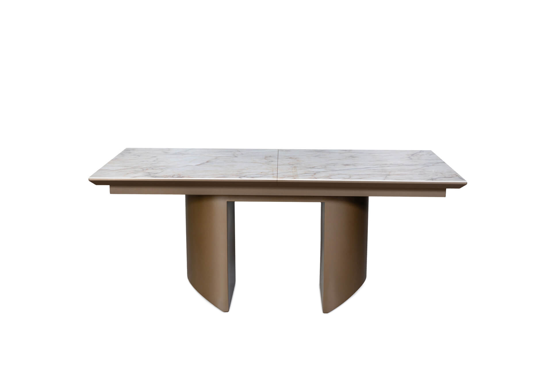 Blat wykonany został z ekskluzywnego spieku kwarcowego Cristallo Macchia Vecchia Starlit, którego wyrafinowany rysunek kamienia w odcieniach bieli, beżu i delikatnego złota nadaje stołowi luksusowy charakter. Całość osadzona jest na solidnej ramie MDF oraz dwóch metalowych tubach w kolorze szampańskim, które pięknie dopełniają elegancki wygląd mebla.
