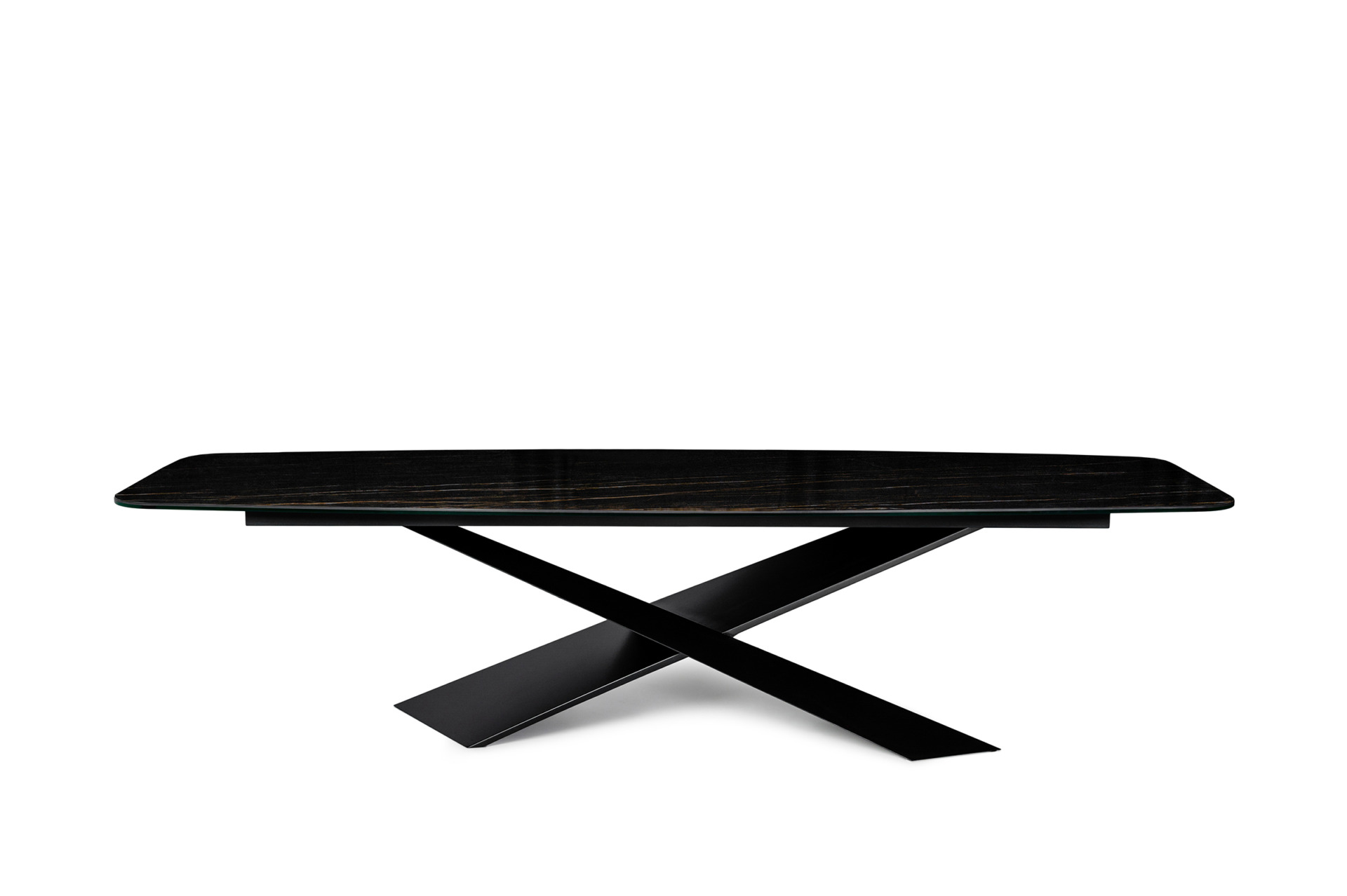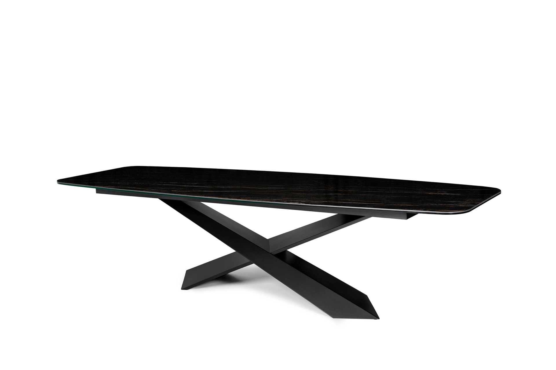 Podstawa stołu wykonana została z malowanej proszkowo stali w kolorze czarnego matu, o dynamicznej formie skrzyżowanych płyt. Geometryczny układ nóg nadaje całej konstrukcji lekkości, a jednocześnie gwarantuje wyjątkową stabilność.