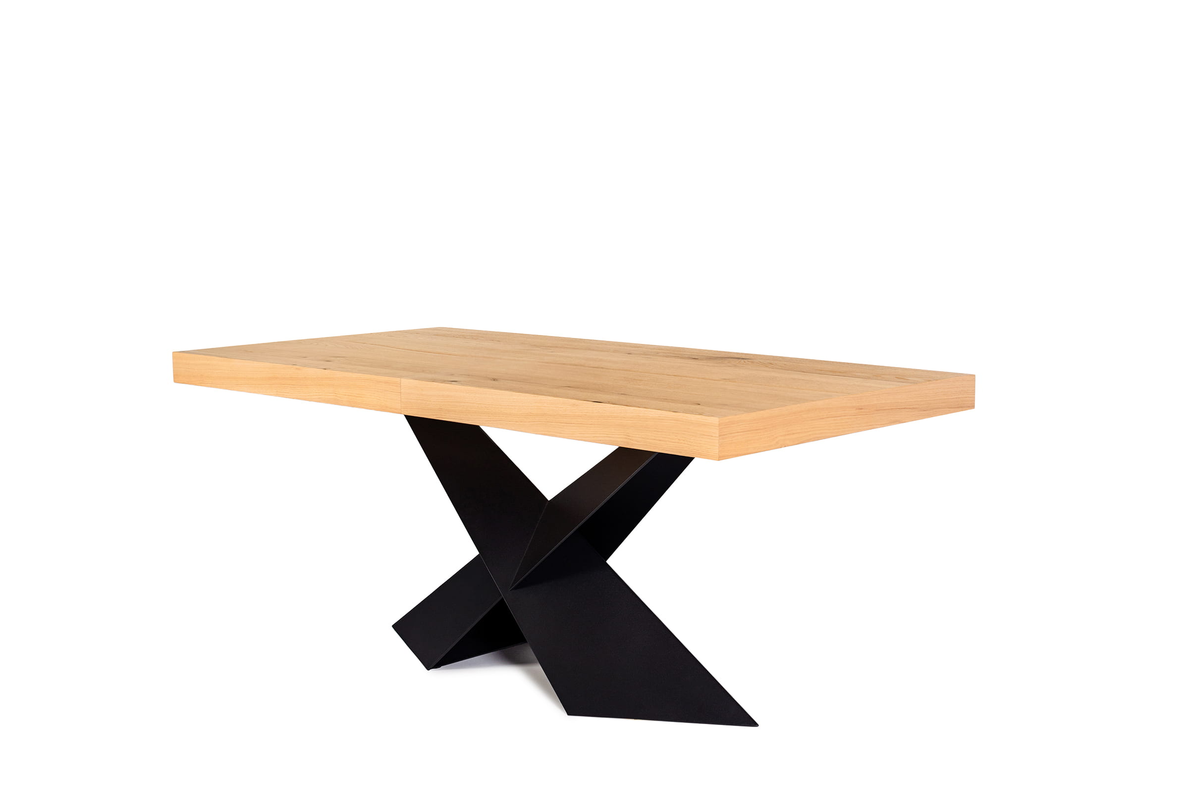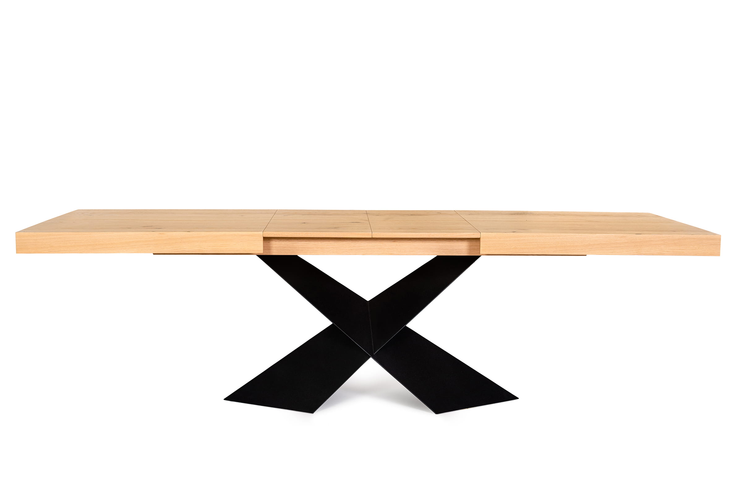 - Metalowa noga w formie litery „X” w czarnym, proszkowo malowanym wykończeniu nie tylko chroni metal przed korozją, ale także nadaje stołowi lekkości i stabilności.