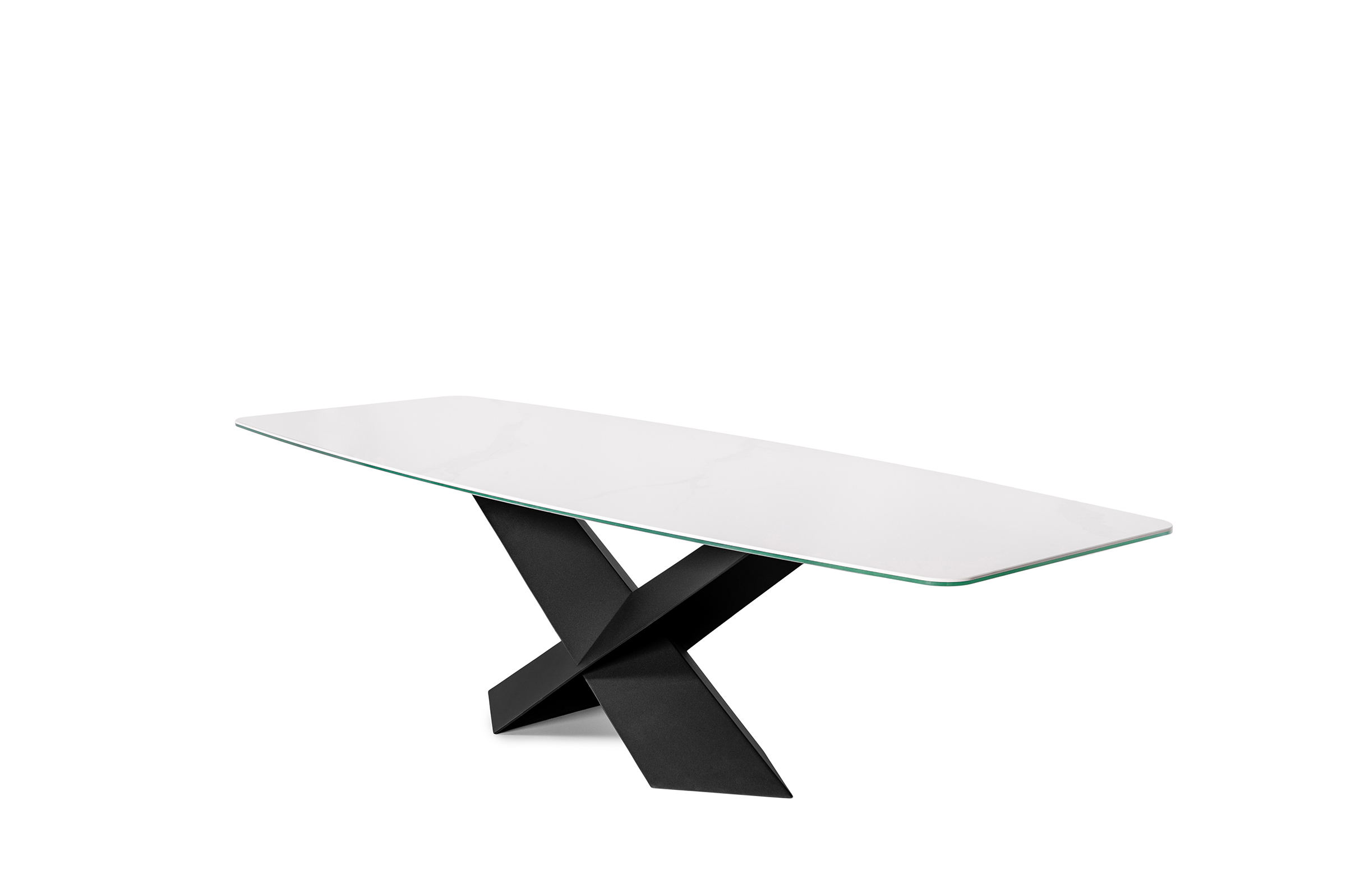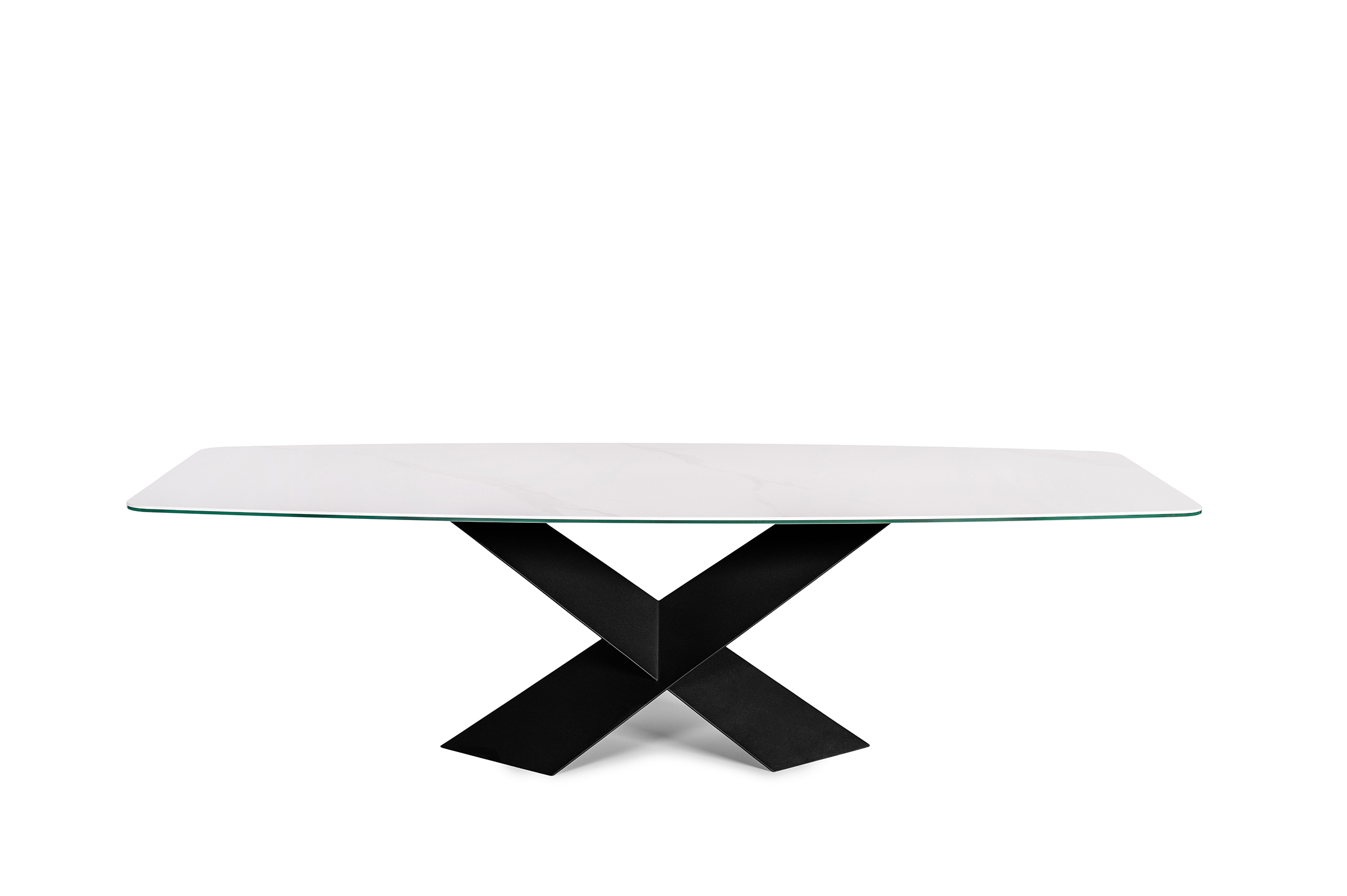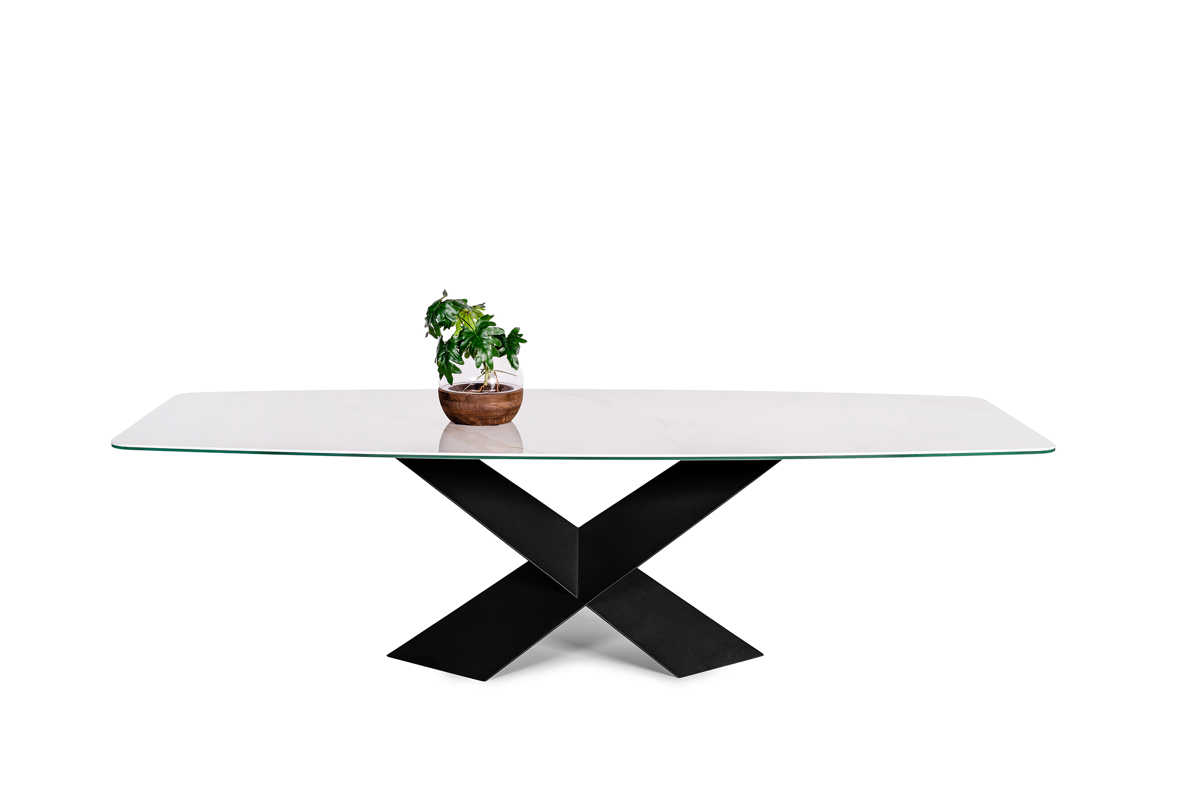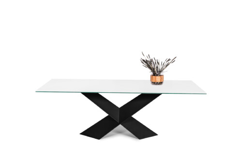 Stół A28 to wyraz nowoczesnego podejścia do designu, będący doskonałą harmonią pomiędzy estetyką a funkcjonalnością. Jego wyjątkowy kształt, wyposażony w blat z spieku kwarcowego o matowym wykończeniu, idzie w parze z metalową nogą w intensywnym czarnym kolorze w formie litery X, co nadaje mu wyjątkowy charakter.