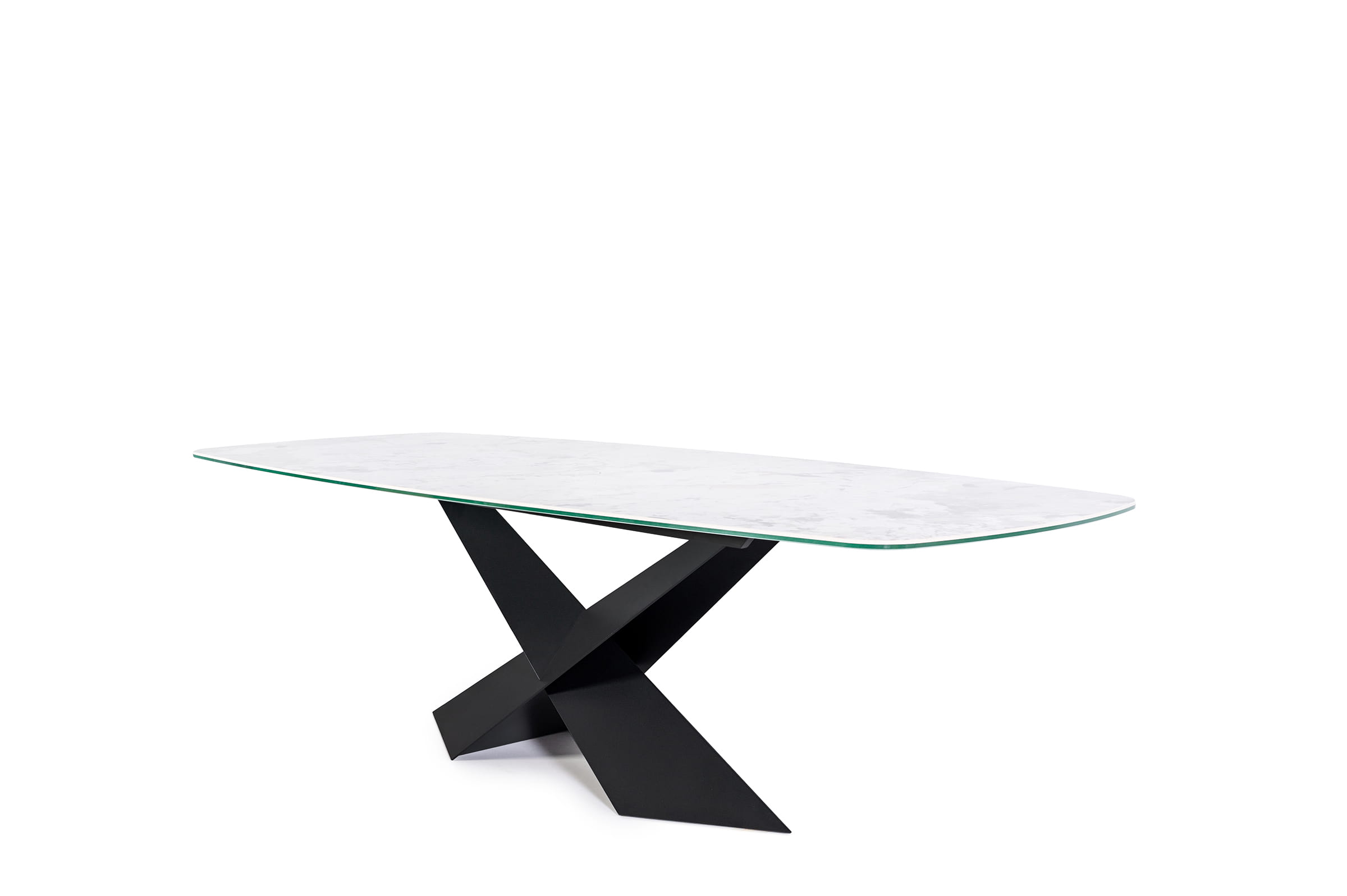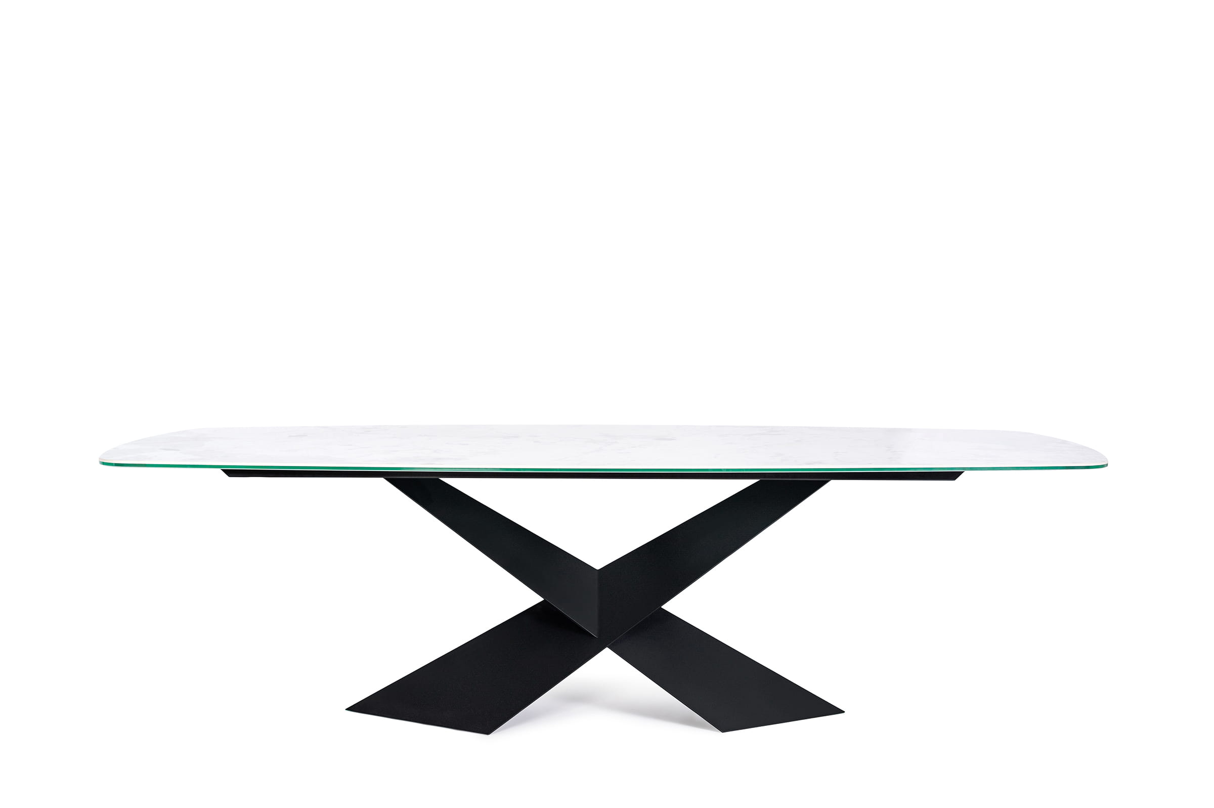 Stół A28 to połączenie nowoczesnej estetyki oraz trwałości, które zapewnia wygodę i elegancję w codziennym użytkowaniu. Charakterystyczny blat w kształcie beczki, wykonany ze spieku kwarcowego Macchia Vecchia w wykończeniu połysk, pięknie podkreśla lekkość bryły, a czarna noga w formie litery X dodaje mu wyrazistego, nowoczesnego charakteru.
