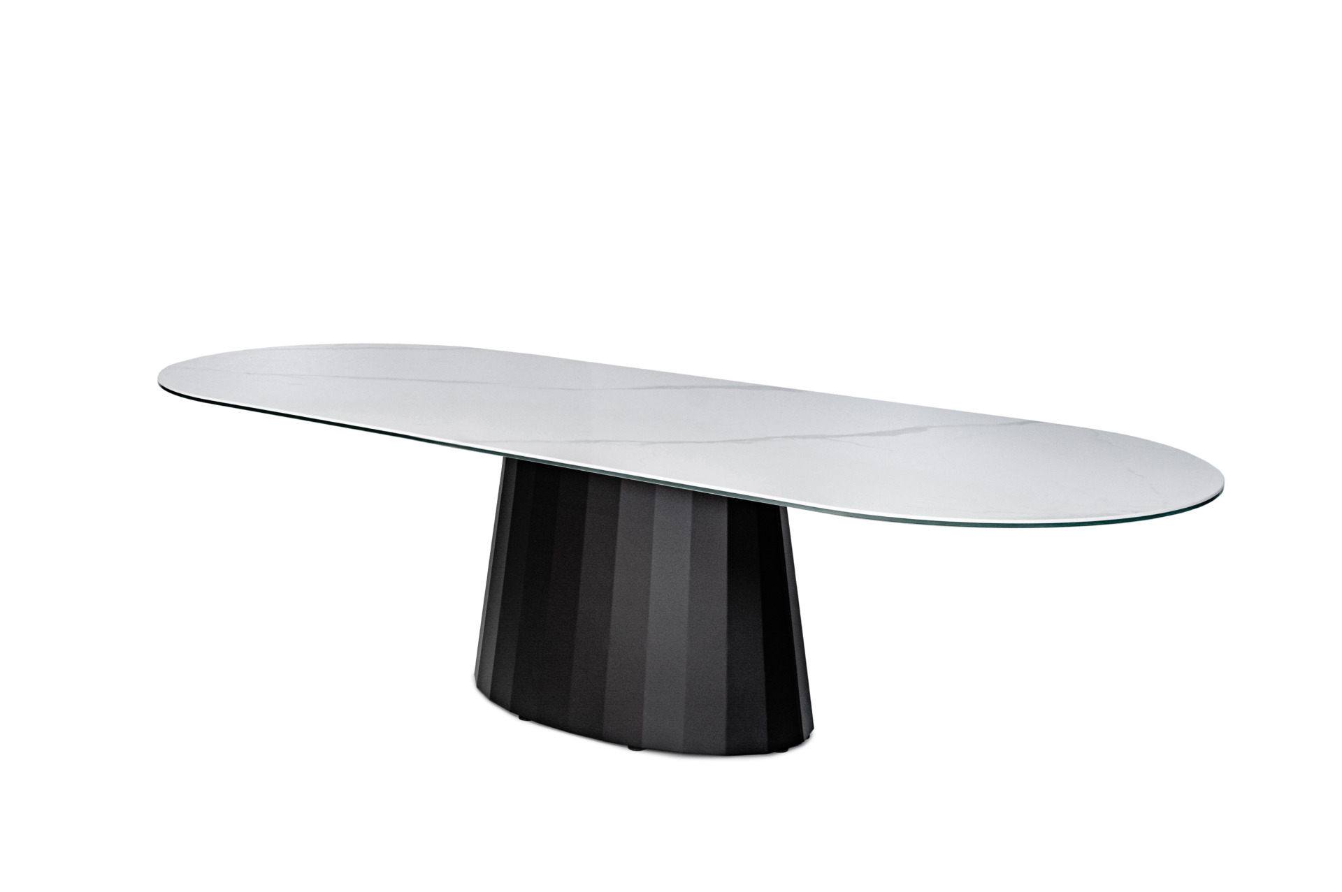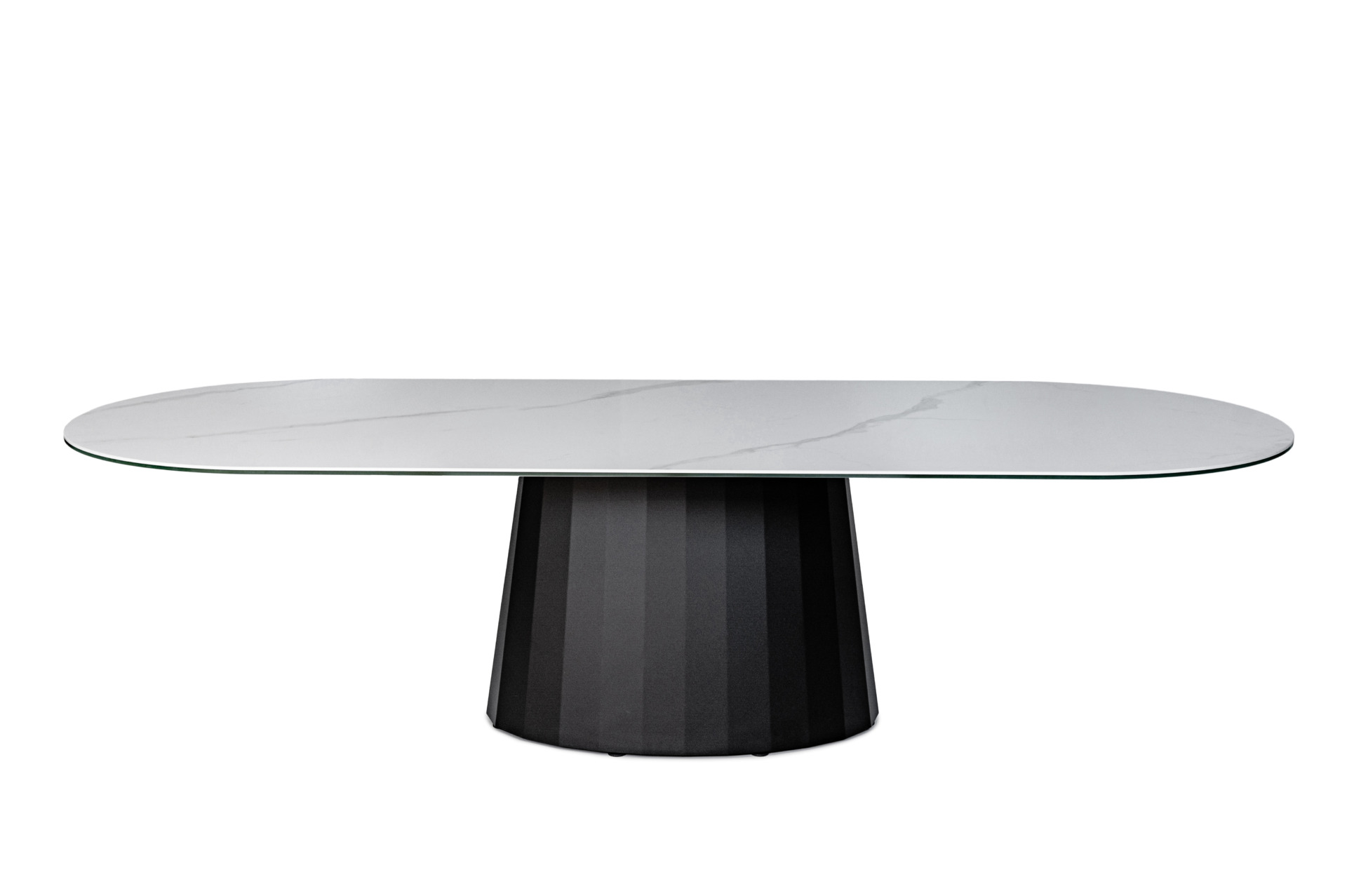 Całość wsparta jest na eleganckiej, nowoczesnej nodze w kolorze czarnym, która nadaje konstrukcji stabilności i wyrazistego, designerskiego charakteru. Czerń podstawy doskonale kontrastuje z jasnym blatem, tworząc efektowną i ponadczasową kompozycję, idealnie wpisującą się w nowoczesne wnętrza o wysokim standardzie wykończenia.