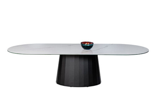 Kształt owal-koło nadaje stołowi lekkości i harmonii, sprawiając, że doskonale prezentuje się zarówno w przestronnych jadalniach, jak i w nowoczesnych salonach. Owalna forma sprzyja spotkaniom przy wspólnym stole, tworząc atmosferę elegancji i bliskości.