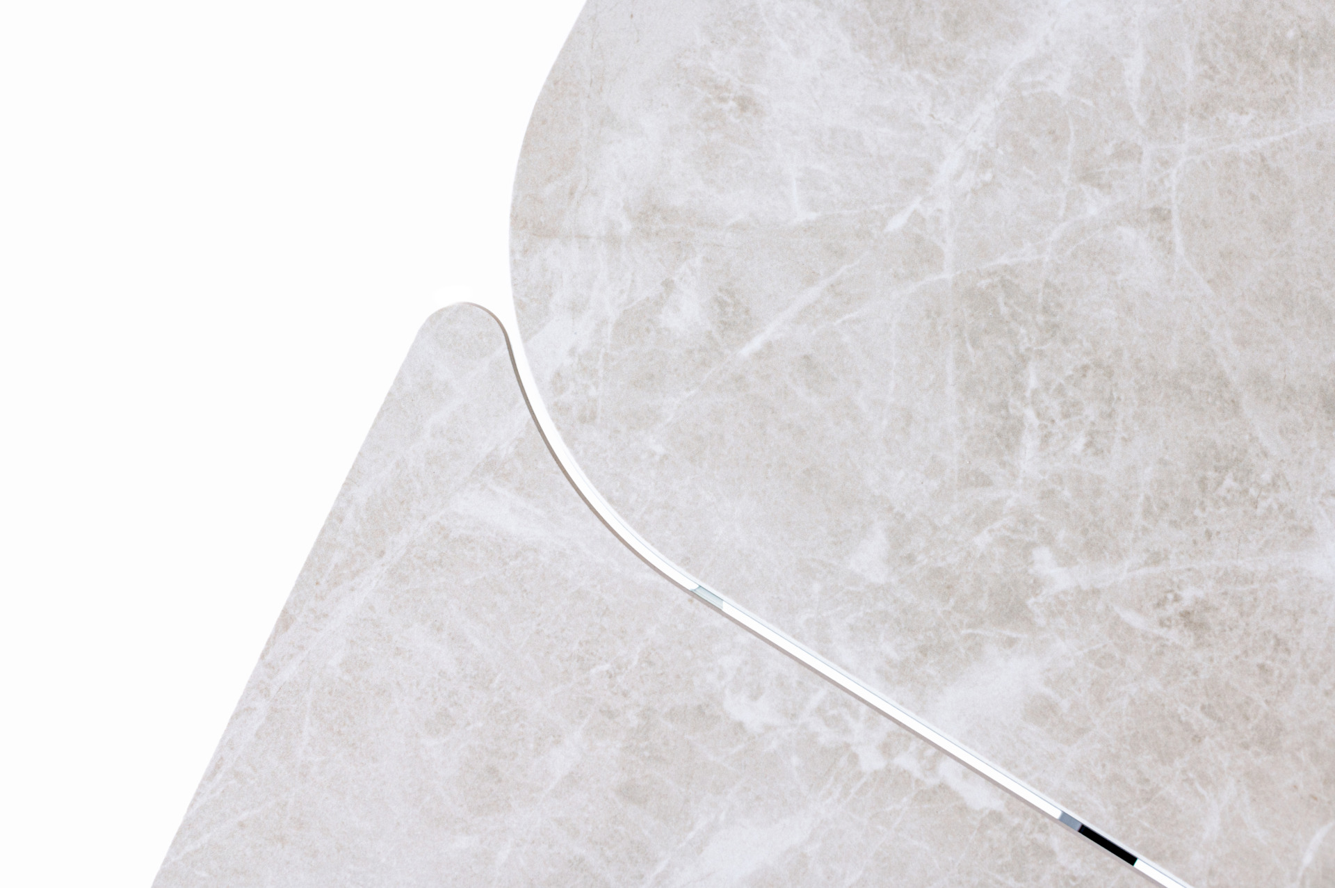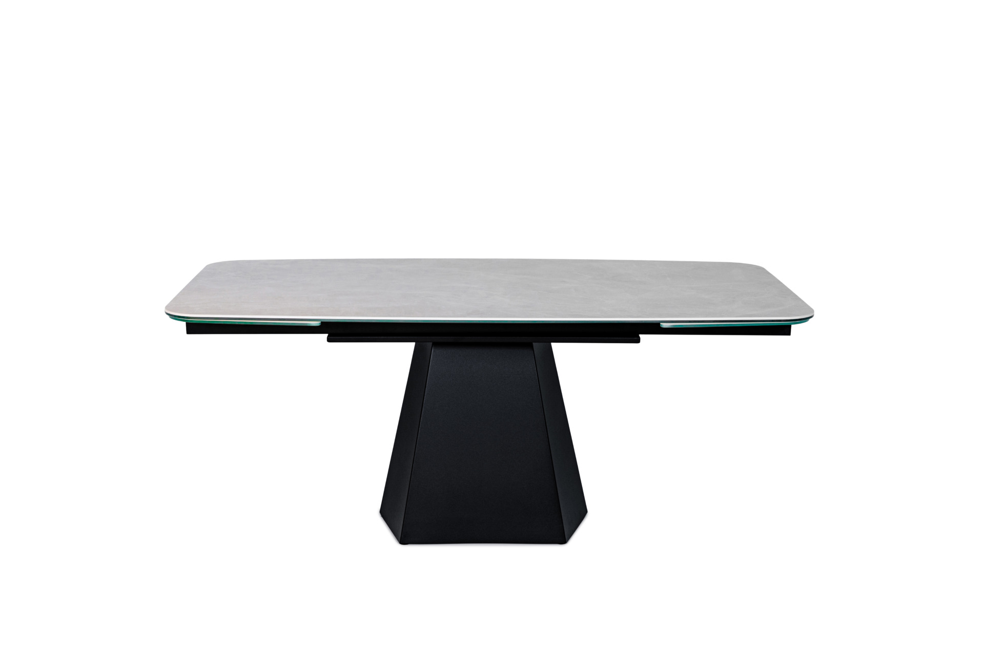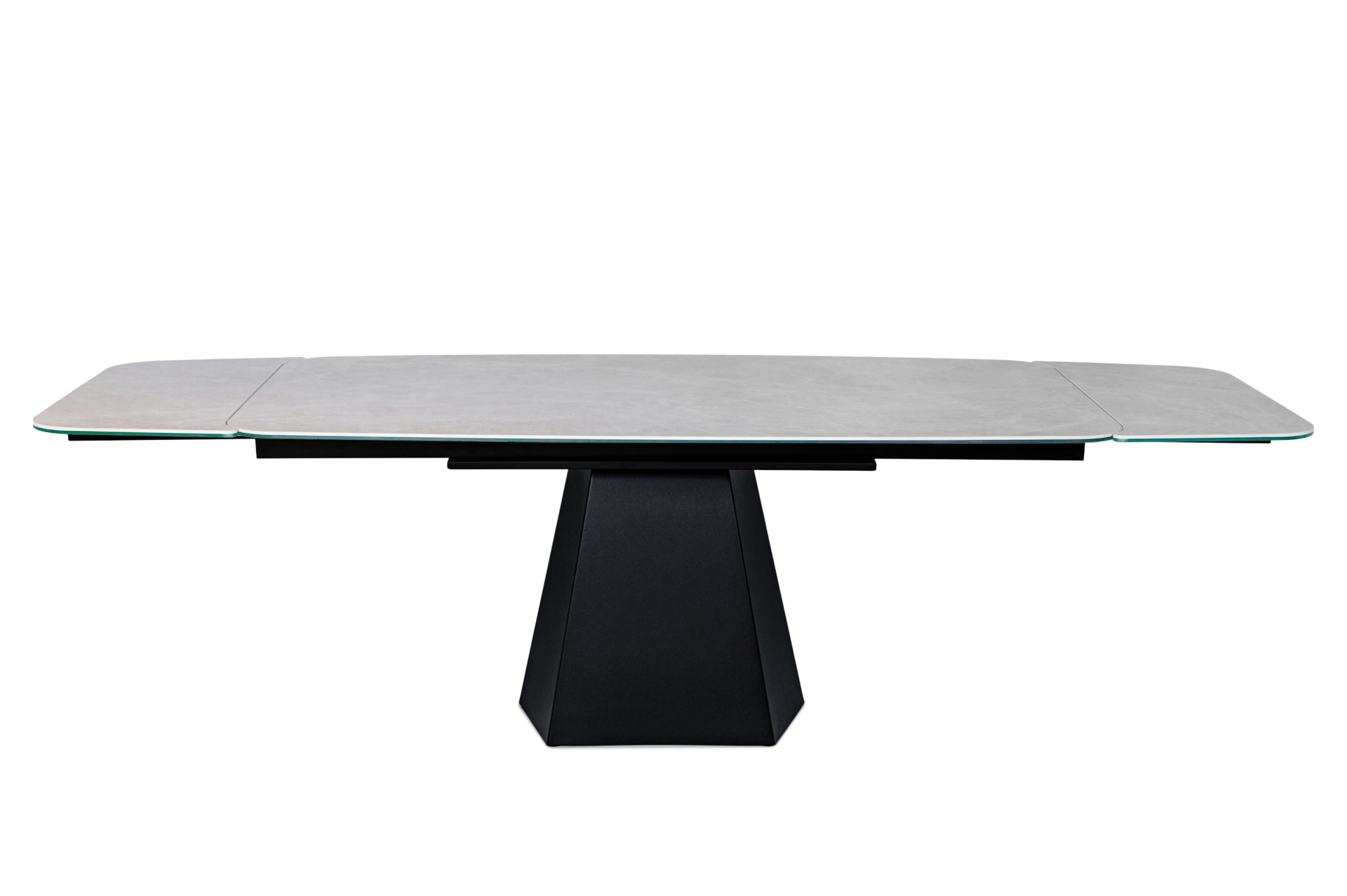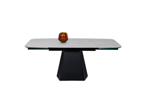 Kształt blatu w formie beczki dodaje meblowi lekkości i miękkości, a jego delikatnie zaokrąglone krawędzie podkreślają elegancki styl wykonania. Całość osadzona jest na nowoczesnej czarnej nodze, której geometryczna forma nadaje stołowi wyjątkowego charakteru. Kontrast pomiędzy jasnym, kremowym spiekiem a głęboką czernią podstawy tworzy wyrazistą, a zarazem wyjątkowo elegancką kompozycję, idealną do wnętrz w stylu nowoczesnym, loftowym lub glamour.