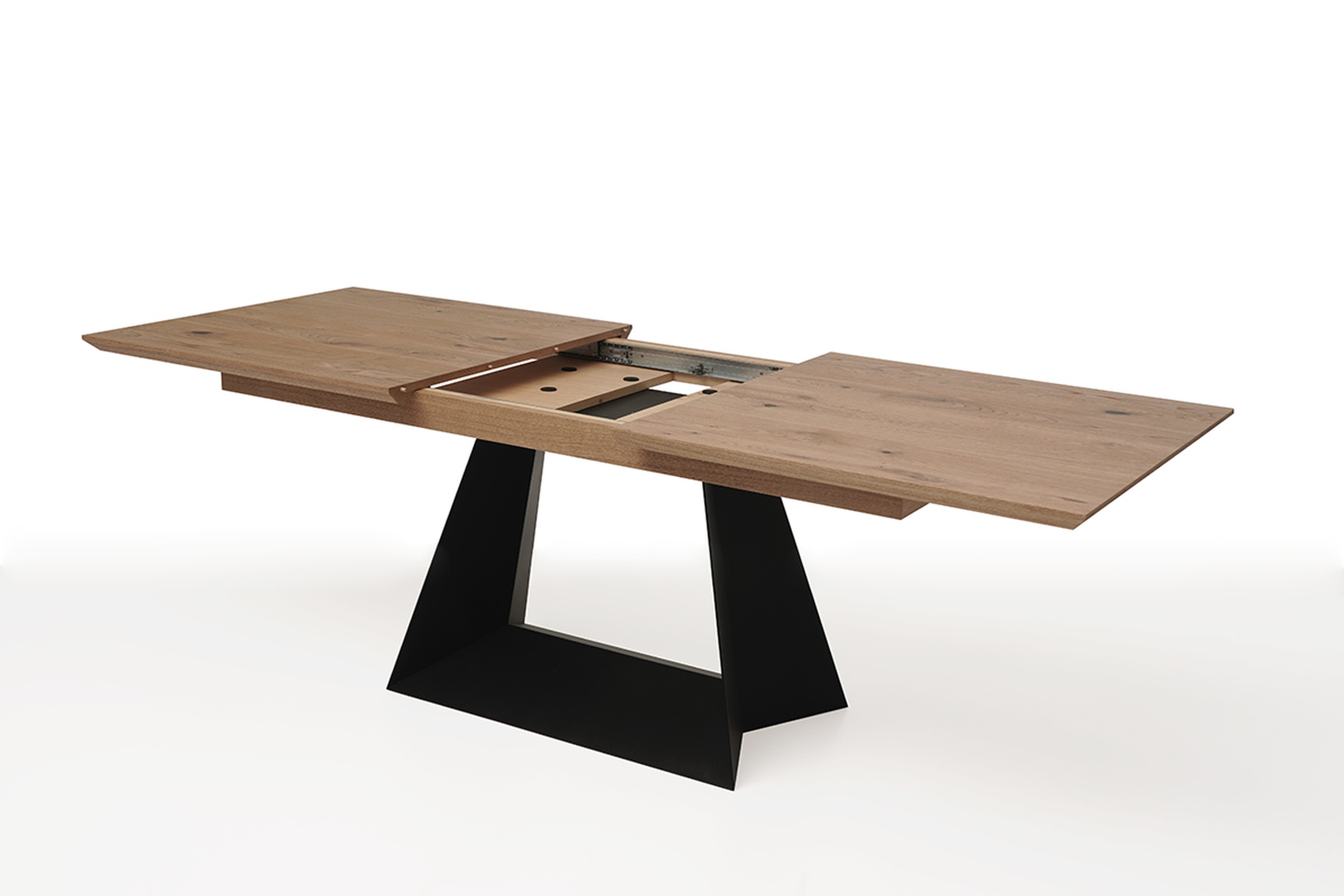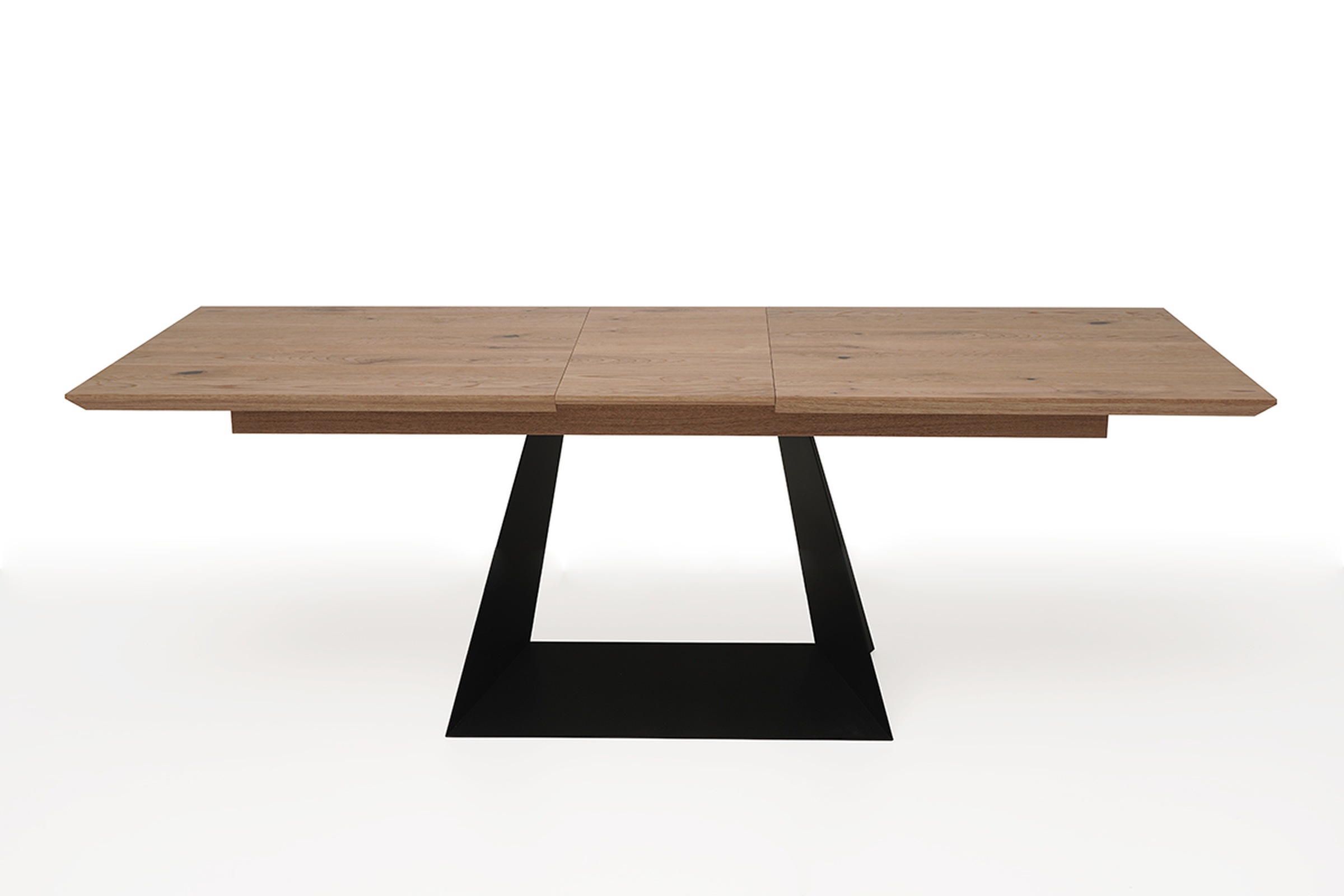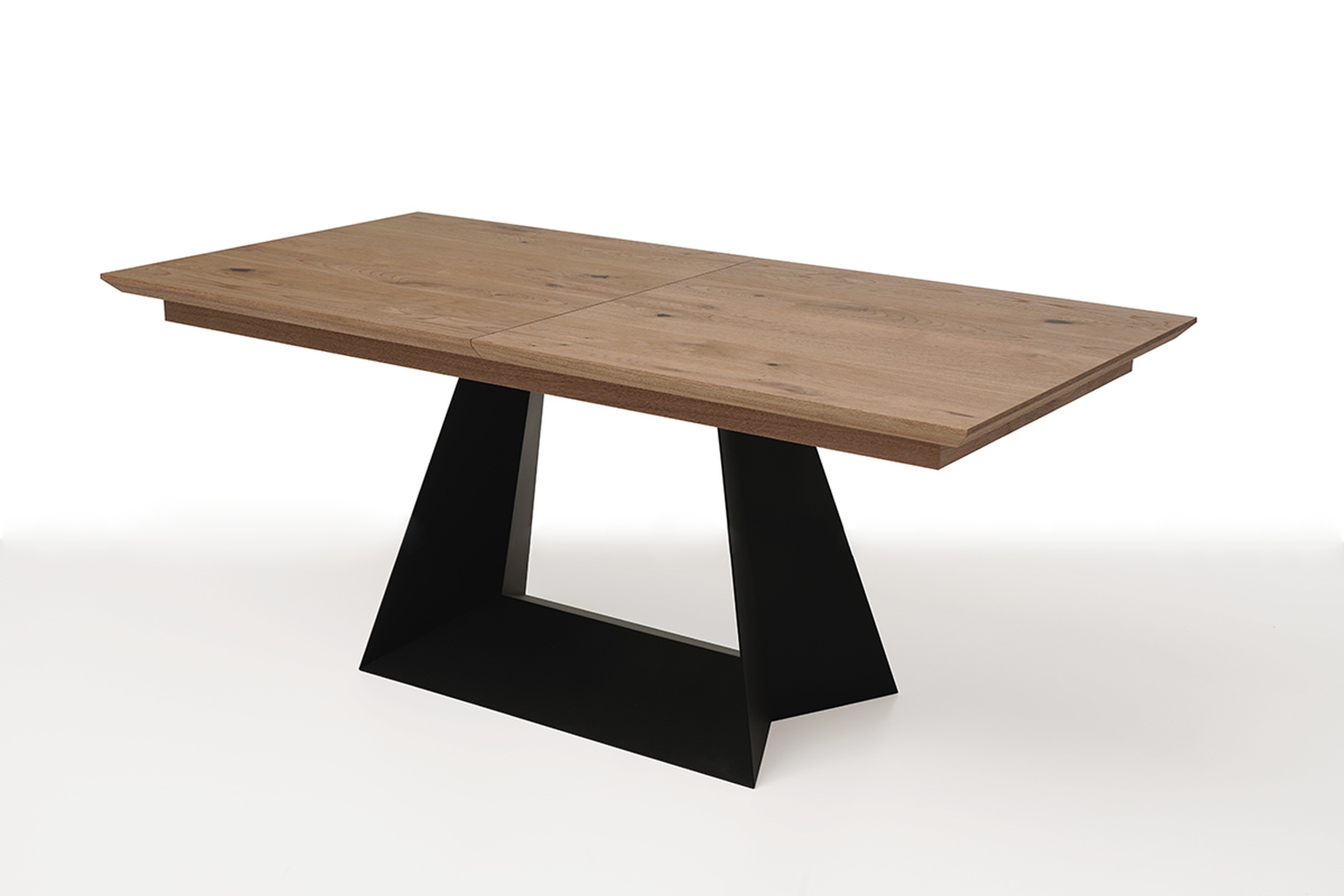 Stół Soil z blatem rozkładanym z forniru dąb sękaty szczotkowany. Podstawa wykonana jest z arkuszy blachy stalowej lakierowanej proszkowo. Wbrew pozorom metalowa podstawa nadaje lekkości stołu, zwłaszcza w wersji z grubym masywnym blatem dębowym o grubości 8 cm. Czarna podstawa tego nowoczesnego stołu pomalowana jest proszkowo, co chroni metal przed powstawaniem korozji.