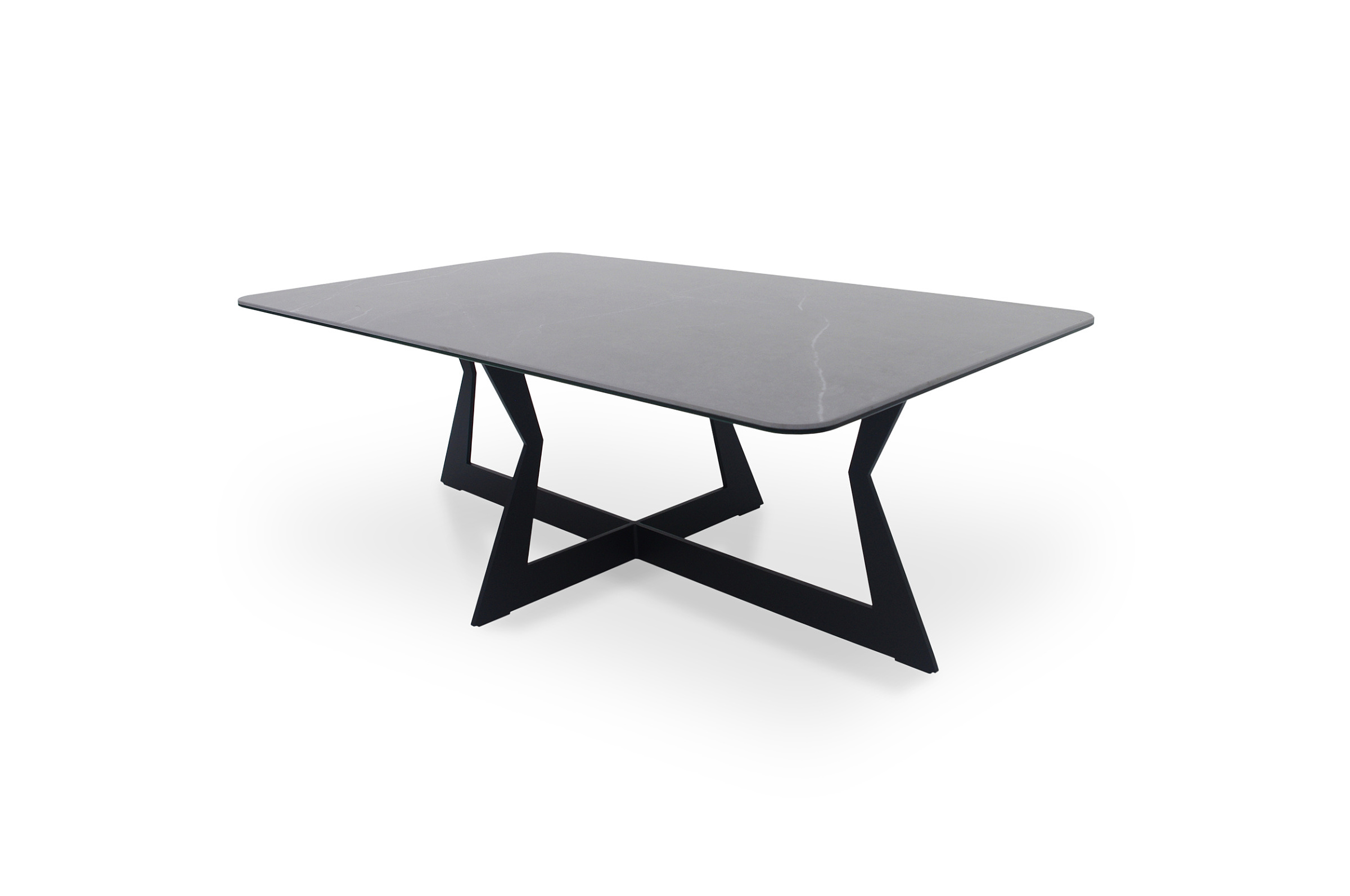 Stolik kawowy B24 z blatem imitującym marmur na metalowych nogach. Blat jest wykonany ze spieku kwarcowego klejonego na szkle, z matową powierzchnią. Blat spiekowy prostokątny z rogami zaokrąglonymi R50.