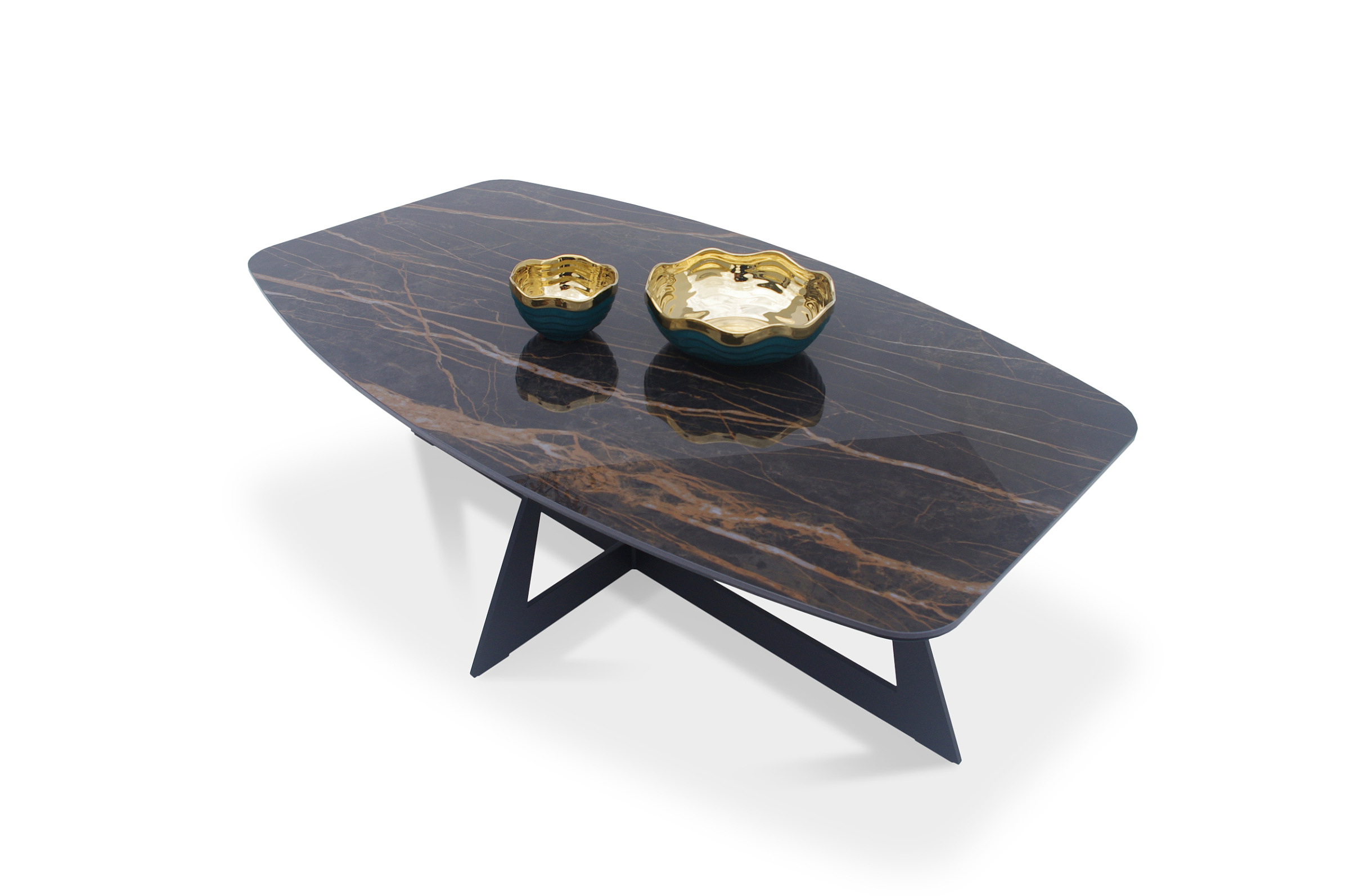 Stolik kawowy B24 z blatem spiekowym Laminam. Blat jest wykonany ze spieku kwarcowego klejonego na szkle, z polerowaną powierzchnią. Kształt prostokątny beczka.