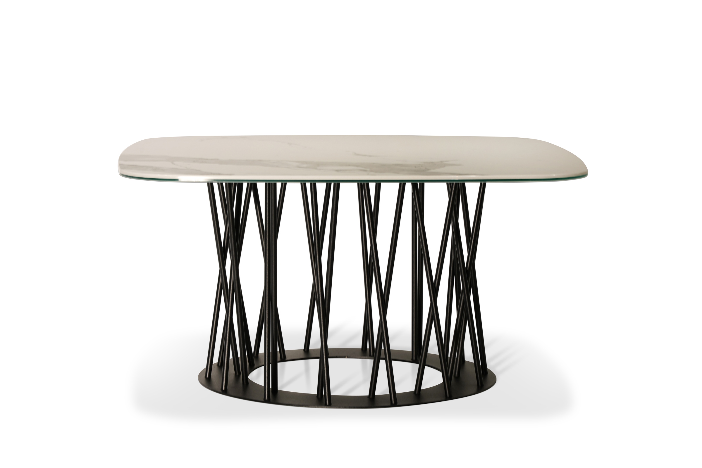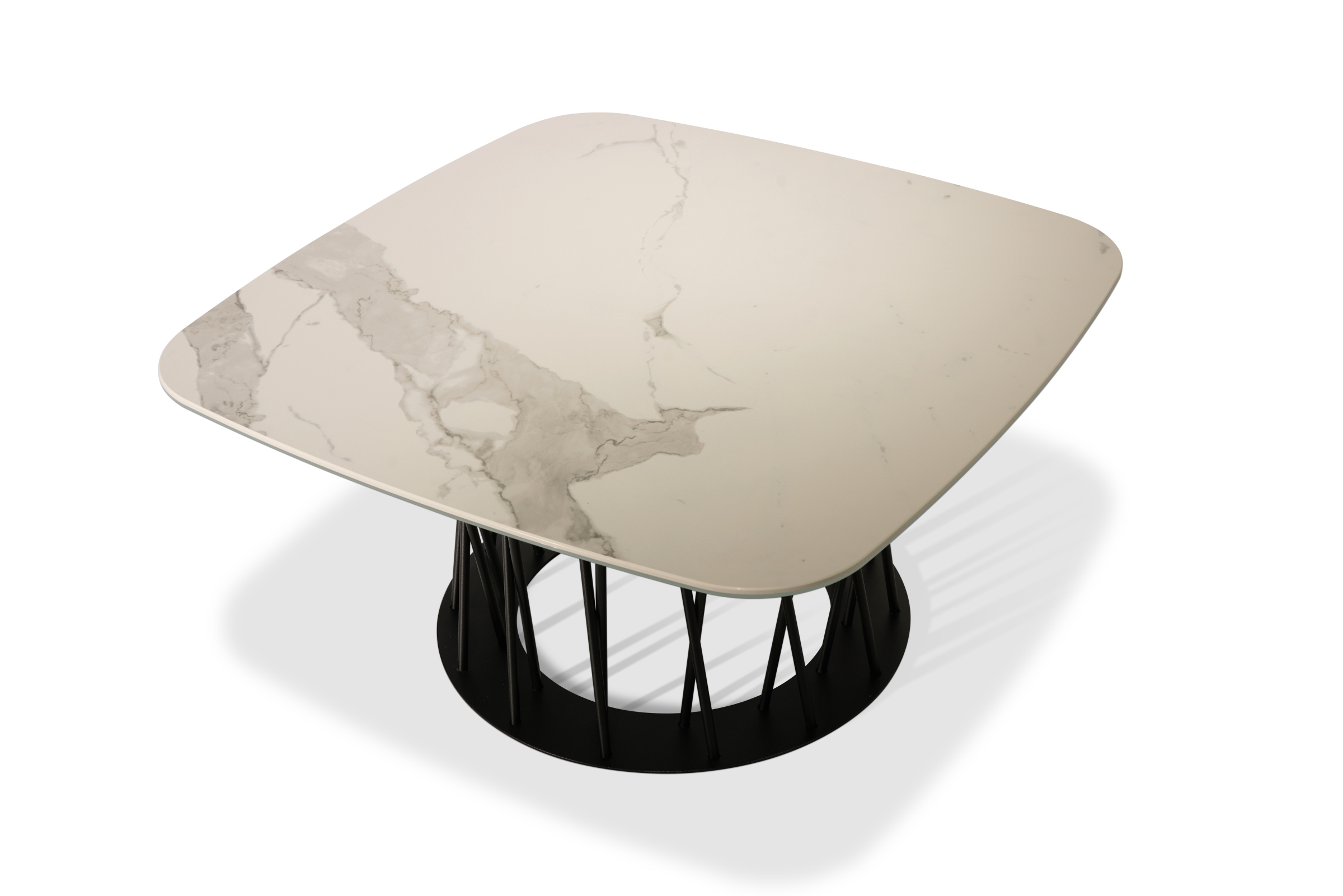 B33 stolik kawowy z matowym spiekiem kwarcowym. Model pokazany na zdjęciach posiada blat w kolorze: Statuario Venato.