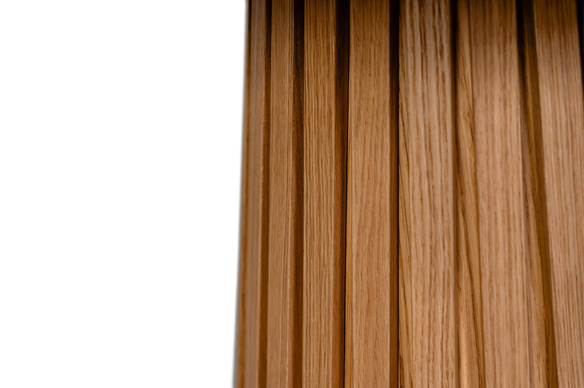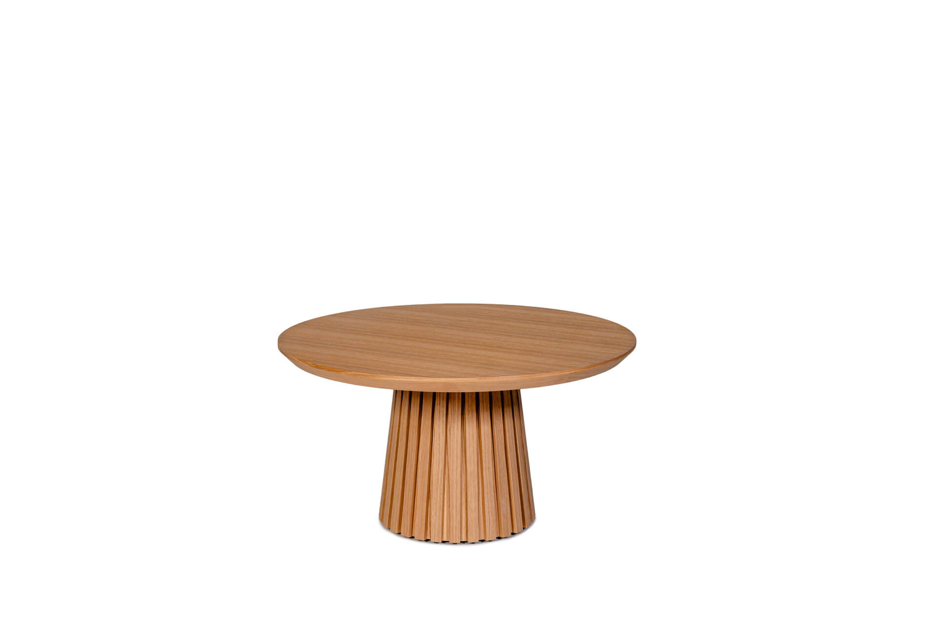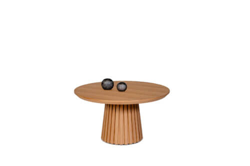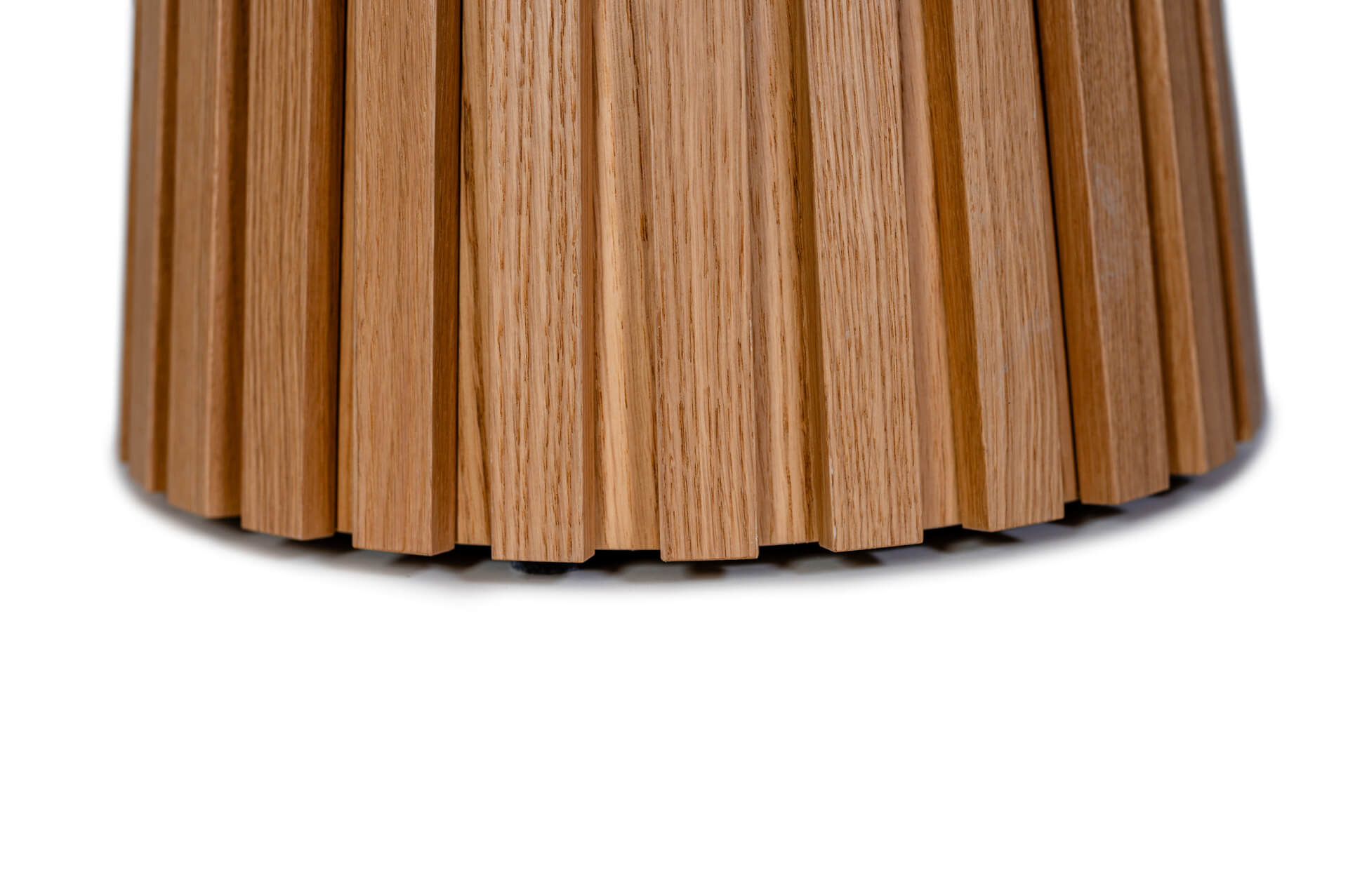 Charakterystyczna stożkowa podstawa z pionowymi lamelami w kolorze blatu nadaje mu unikalny, dekoracyjny rytm, tworząc efekt trójwymiarowej lekkości. Okrągły blat o ściętej krawędzi pod kątem 45° subtelnie podkreśla naturalny rysunek drewna i nowoczesny charakter mebla.