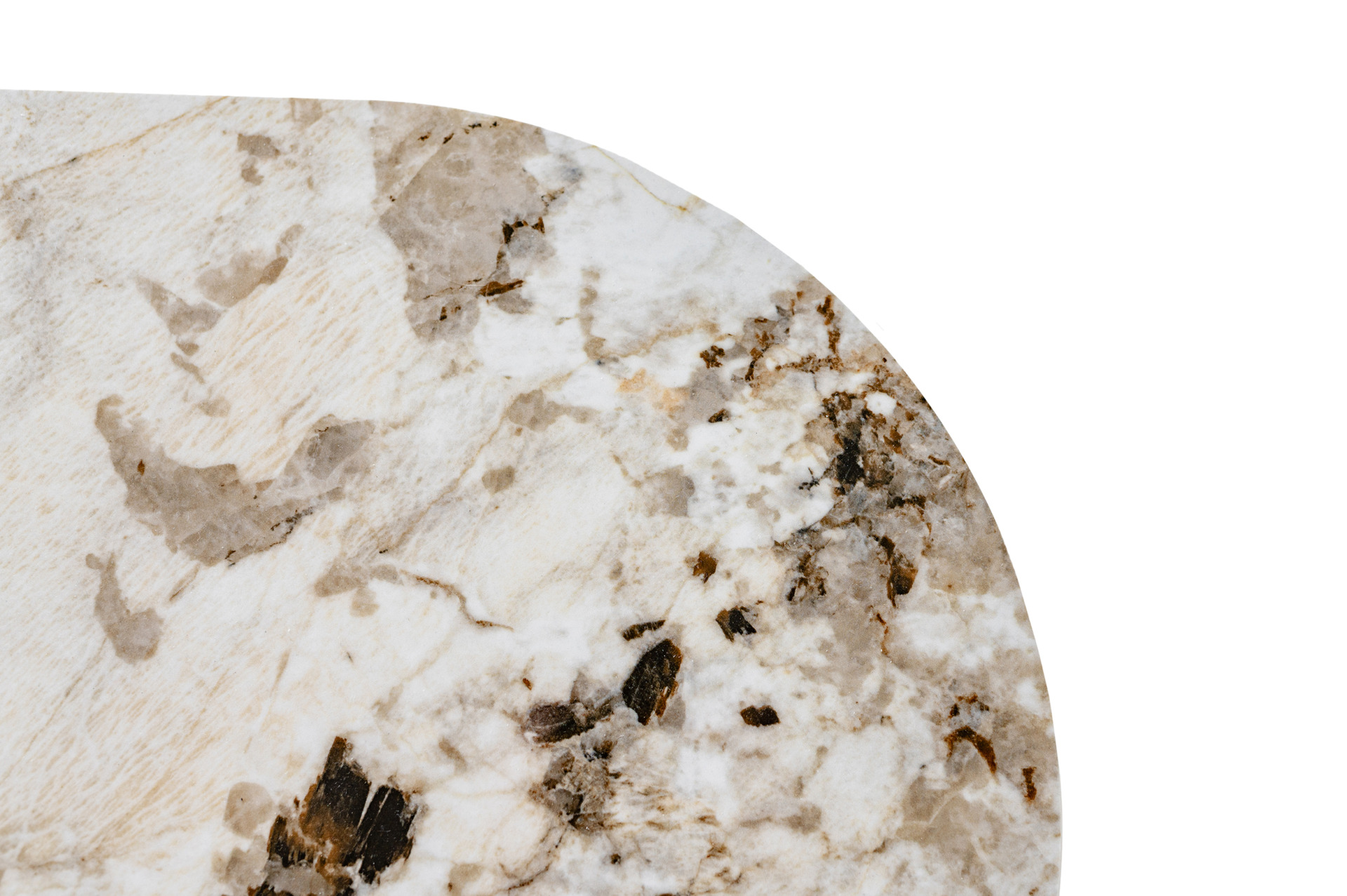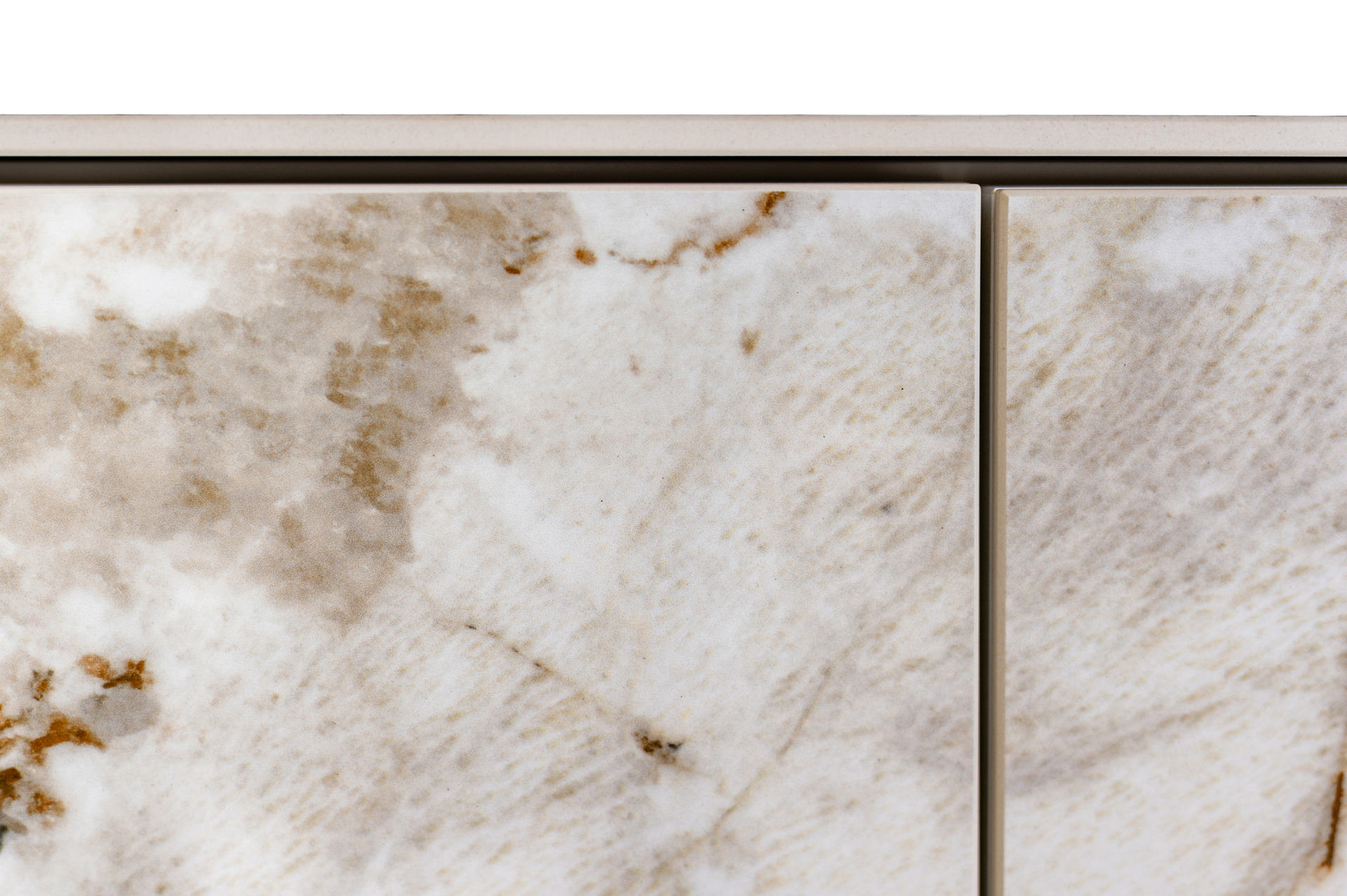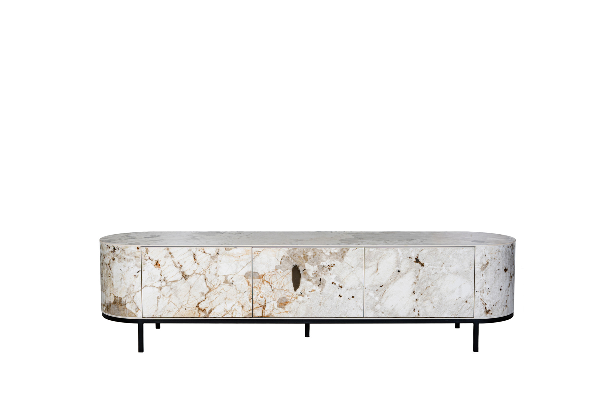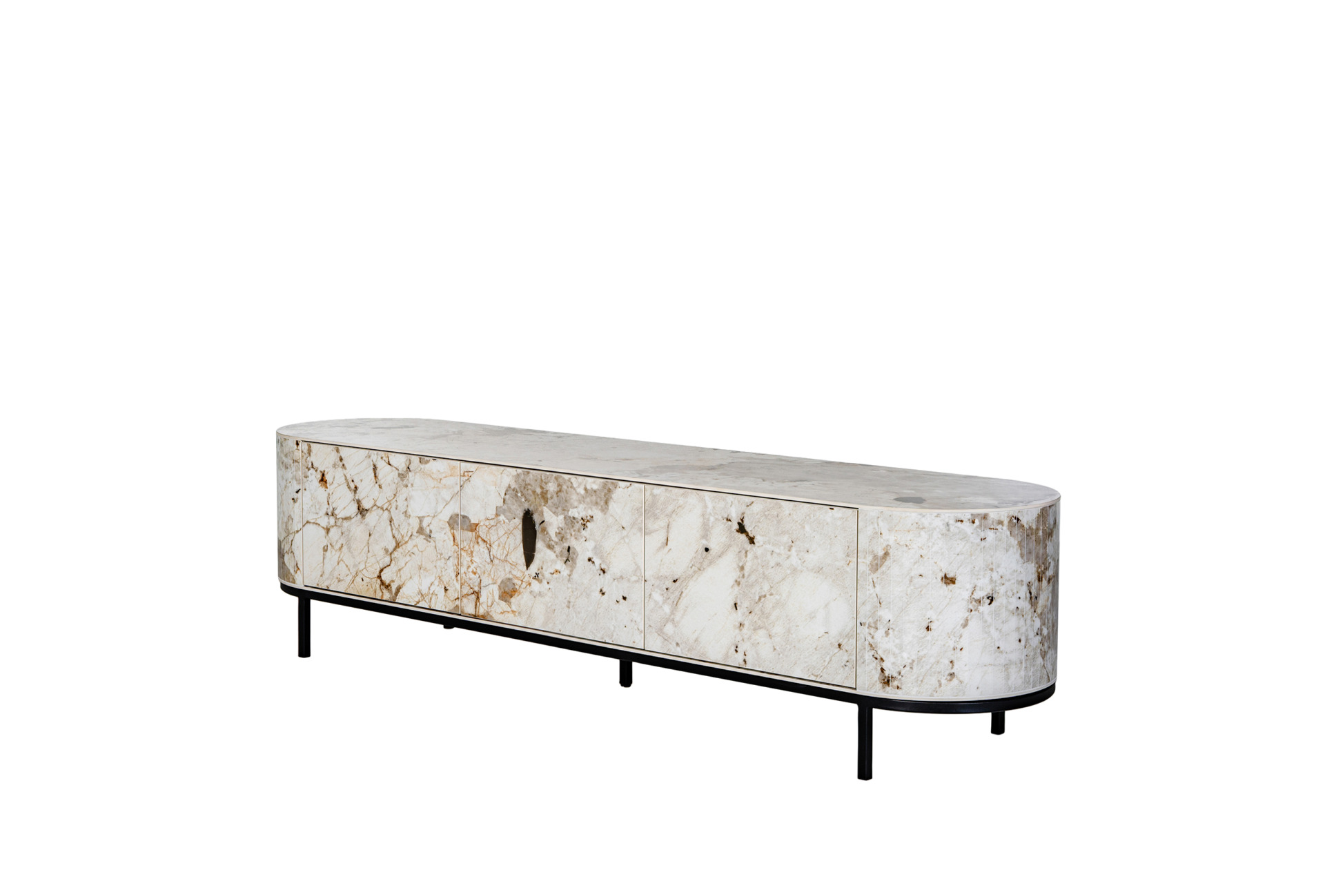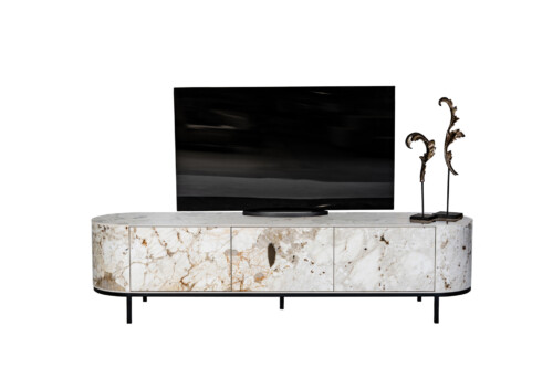 Ta wyjątkowa szafka RTV została zaprojektowana z myślą o miłośnikach nowoczesnego designu i luksusowych wykończeń. Wykonana w całości ze spieku kwarcowego, zachwyca elegancją, subtelną linią oraz solidnym wykonaniem. Jej boczne, zaoblone ścianki wykonane również ze spieku nadają całości lekkości, jednocześnie podkreślając prestiżowy charakter mebla.