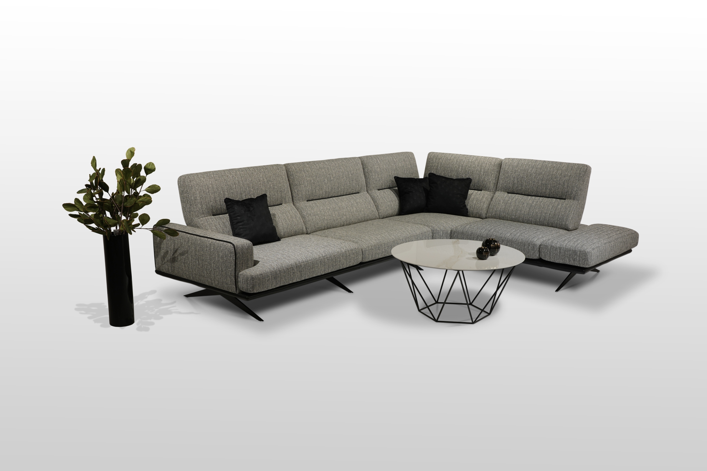 Dostępny jest w formie sofy 3-os, 2-os, fotela, puf oraz wspomnianego narożnika.