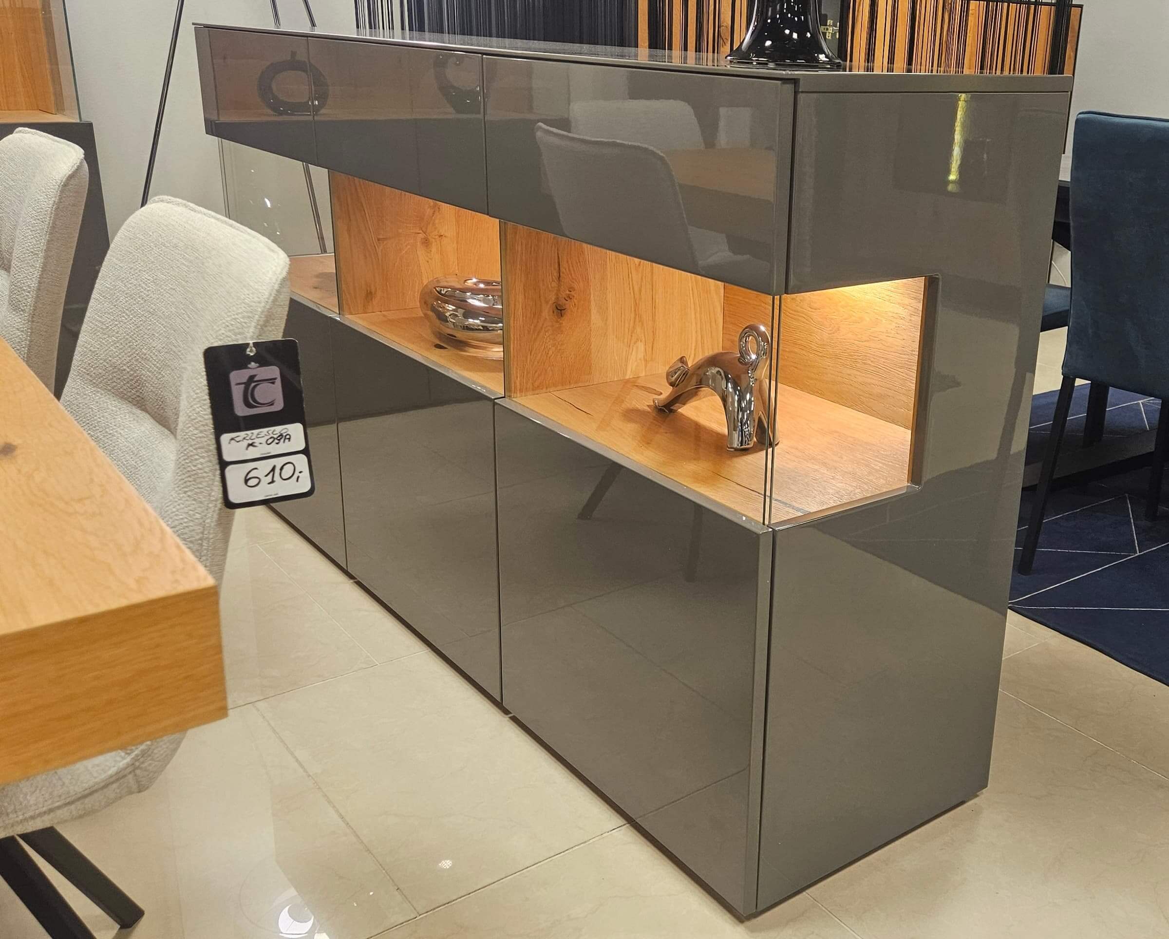 Meble są lakierowane na wysoki połysk w kolorze szarości.