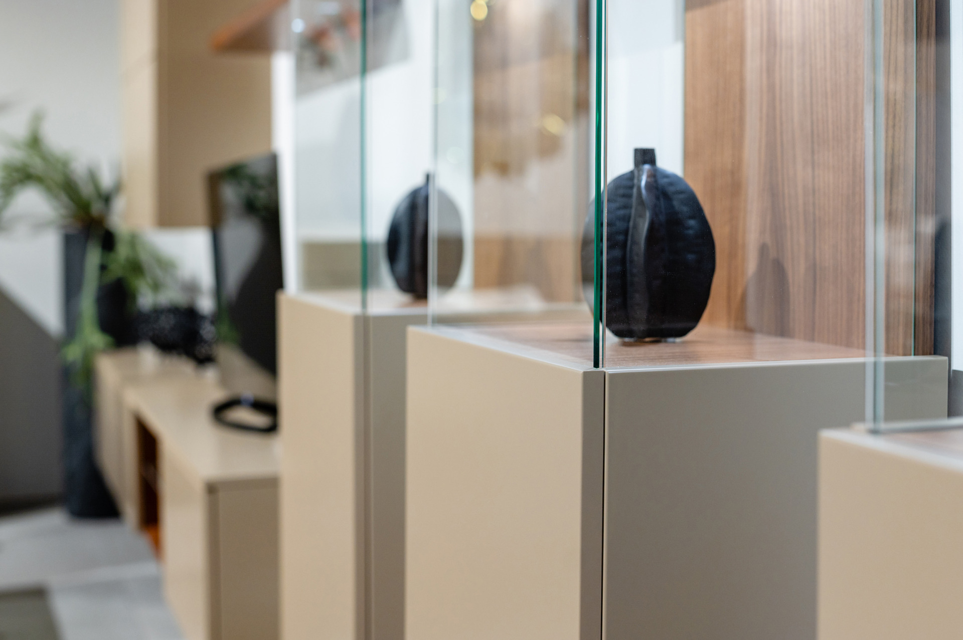 witryny wiszące z przeszklonym frontem i podświetleniem LED,