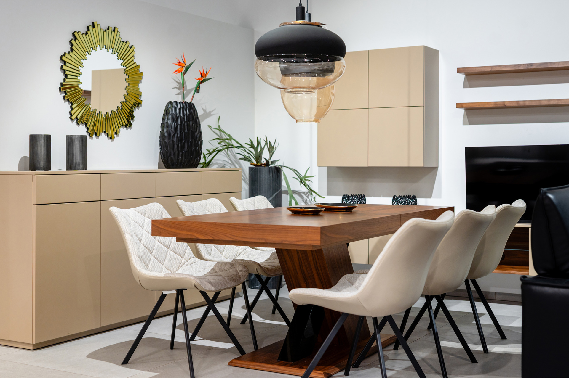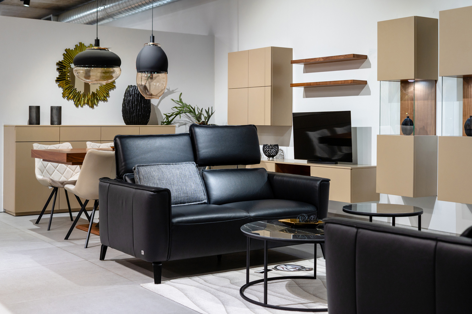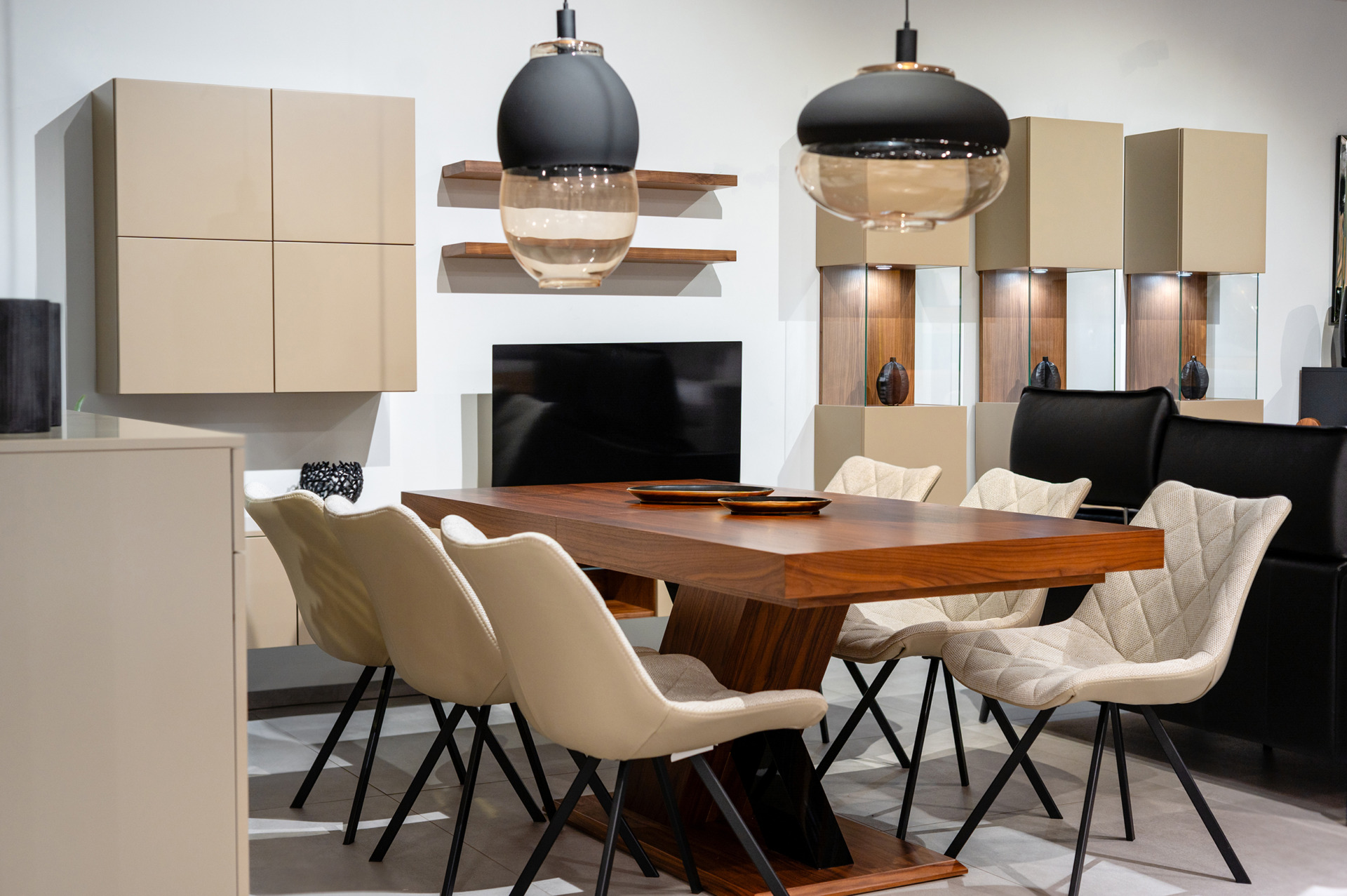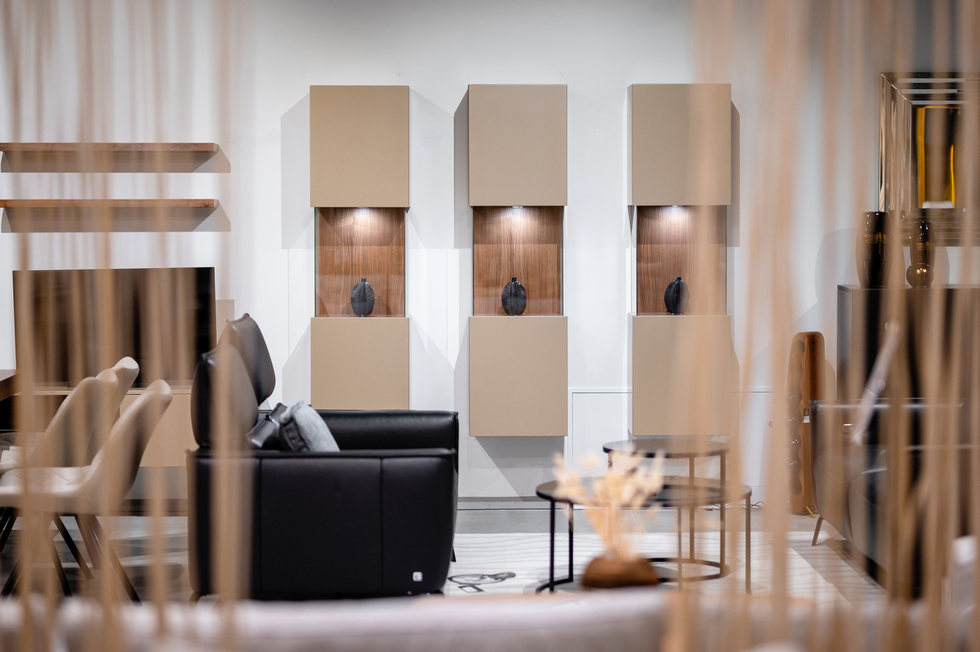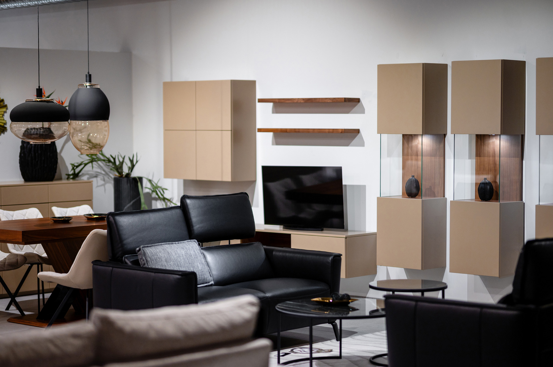 Fronty mebli wykonane zostały z lakierowanego MDF-u w matowym odcieniu beżu / taupe, który tworzy harmonijne, spokojne tło dla codziennego życia. Całość dopełniają akcenty z naturalnego forniru orzecha amerykańskiego, wprowadzające do wnętrza ciepło i szlachetną głębię. Subtelne czarne detale – takie jak listwy, podstawy czy metalowe elementy – podkreślają nowoczesny charakter kolekcji, dodając jej wyrafinowanego kontrastu.