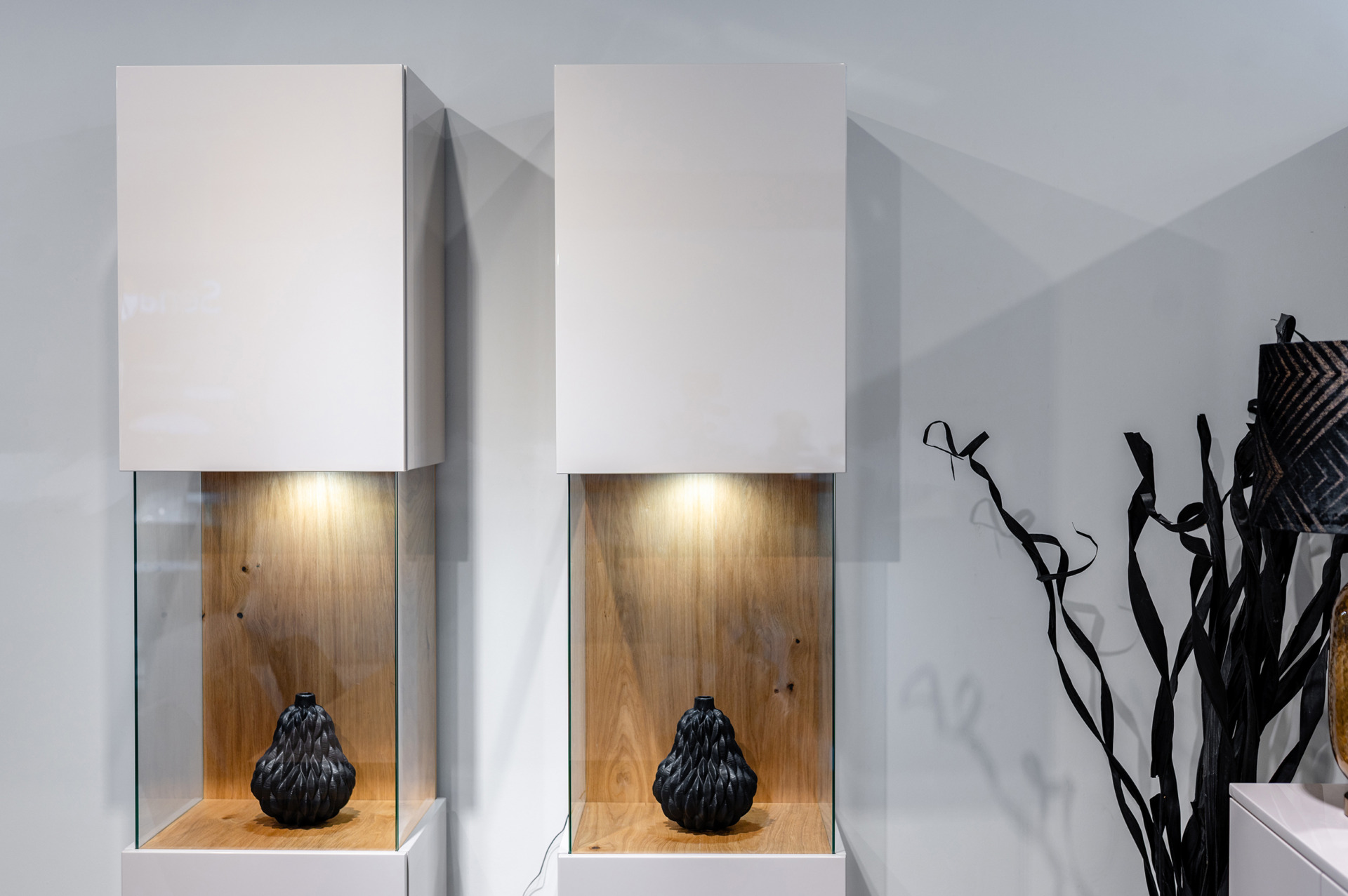 Za przeszkleniem znajduje się naturalna okleina – orzech amerykański.